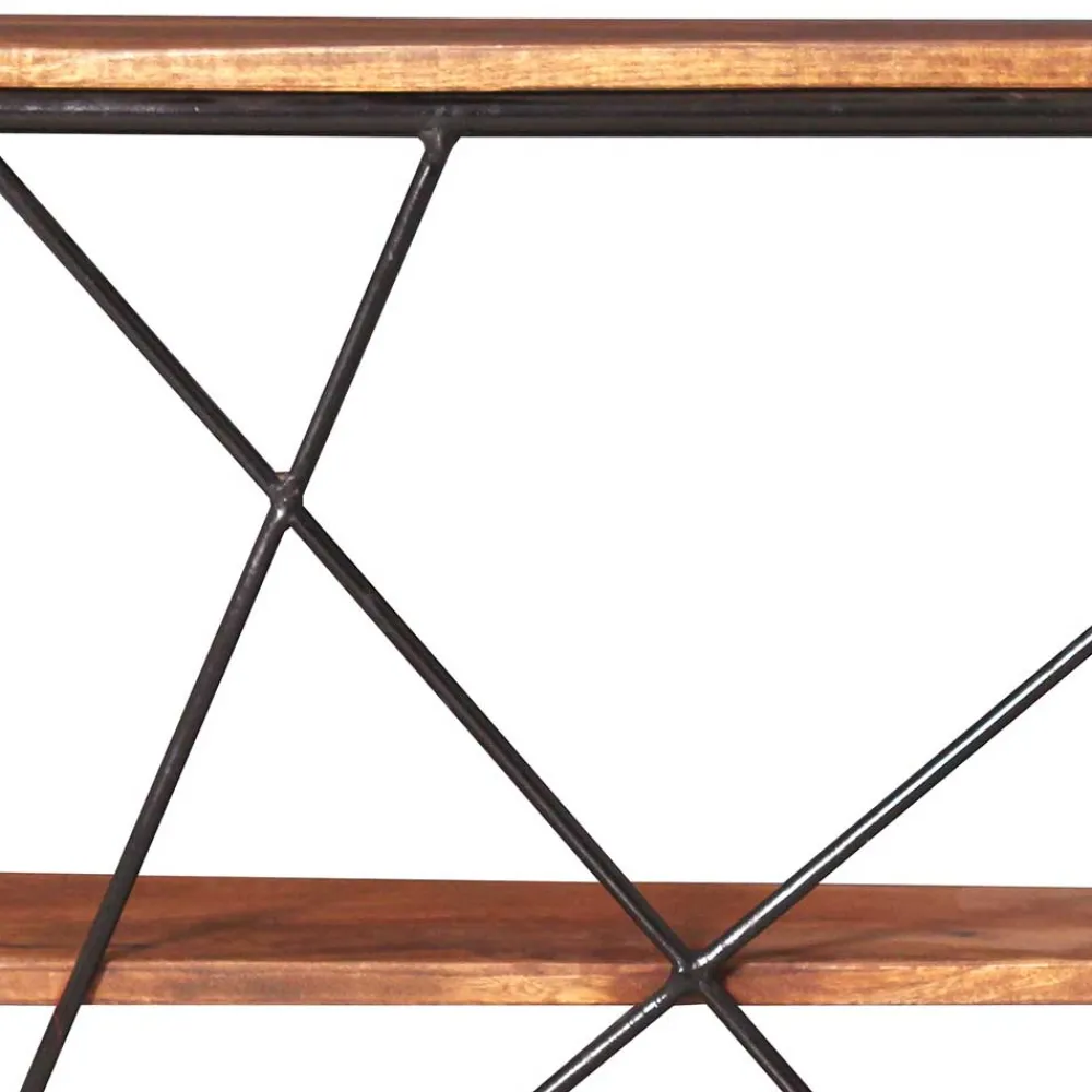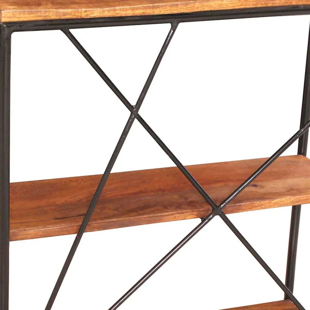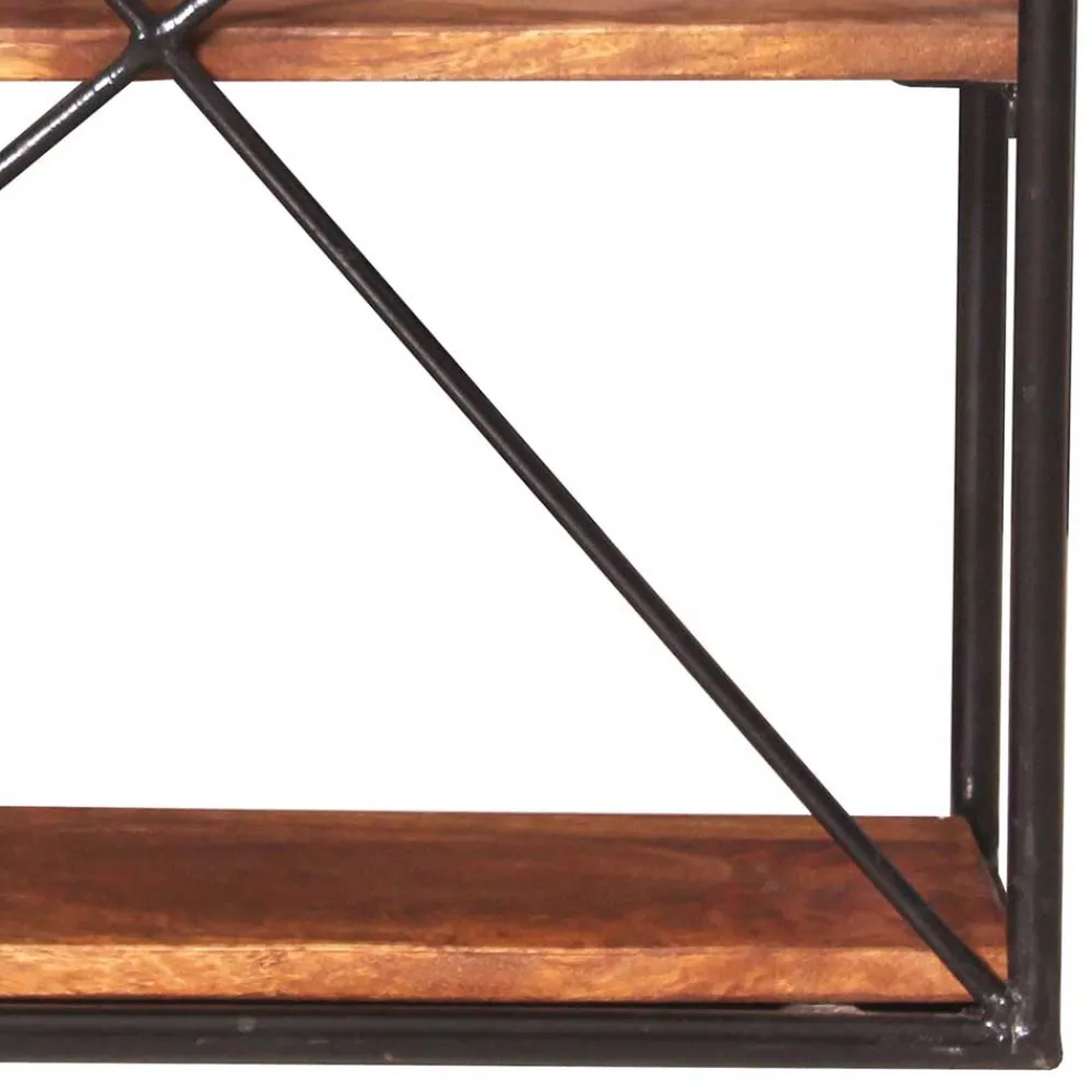 Die asymmetrischen Querstreben aus schwarz lackiertem Metall verleihen dem Regal nicht nur strukturelle Integrität, sondern auch ein visuelles Statement, das die Ästhetik von modernen Industriedesigns widerspiegelt. Die schwarze Lackierung des Metalls sorgt für eine langanhaltende Beständigkeit und Resistenz gegen Abnutzung, was das Regal zu einer lohnenden Investition für jedes Zuhause macht.