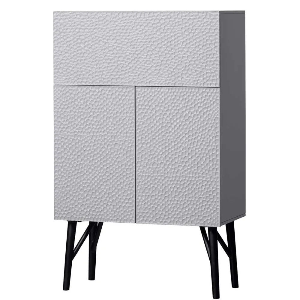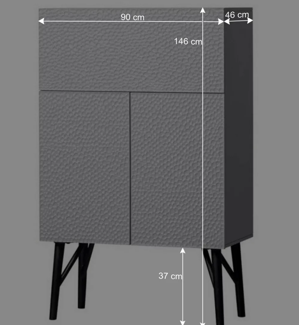 Die Oberflächen des Barschranks sind pflegeleicht lackiert, was ihn besonders pflegefreundlich macht und Ihnen gleichzeitig eine lange Lebensdauer garantiert. Die Türen und die Klappe sind aus geschnitztem Mangoholz gefertigt, das mit einer einzigartigen 3D-Struktur versehen ist – so entsteht eine individuelle und faszinierende Optik, die mit jedem Blick neue Details preisgibt. Der Korpus besteht aus stabilem Kiefernholz, das zusammen mit den Einlegeböden aus Spanplatte und der Rückwand aus HDF für eine robuste Konstruktion sorgt. Abgerundet wird der Look durch das schwarze Metall-Fußgestell, das dem Barschrank eine moderne Leichtigkeit verleiht.