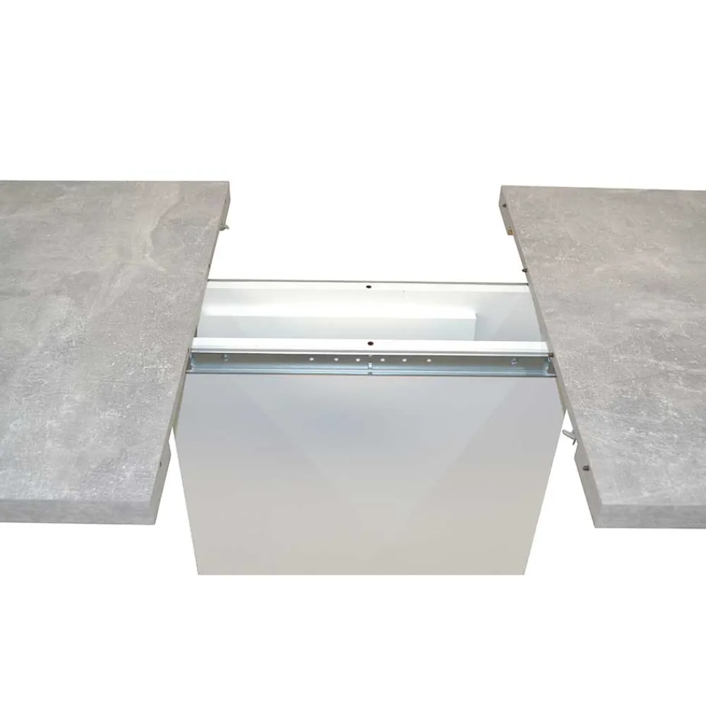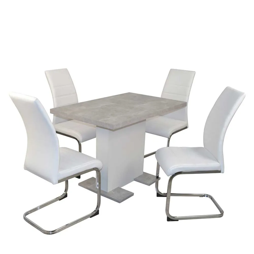 Modernität zeigt sich nicht nur in der Form, sondern auch im gekonnten Zusammenspiel der Materialien und Farben. Weiß, Chrom und eine authentisch wirkende Beton-Optik sorgen für eine kontrastreiche, urbane Ausstrahlung. Der Tisch mit seiner rechteckigen Form präsentiert sich in einer eleganten Mischung aus grauer Beton-Oberfläche und weiß melaminbeschichteten Flächen – ein spannendes Wechselspiel aus Struktur und Klarheit. Die Stühle greifen diesen Stil perfekt auf, mit weißem Kunstlederbezug und glänzend verchromten Metallgestellen. So entsteht ein harmonisches Gesamtbild, das sich nahtlos in moderne Wohnwelten einfügt und gleichzeitig markante Akzente setzt.