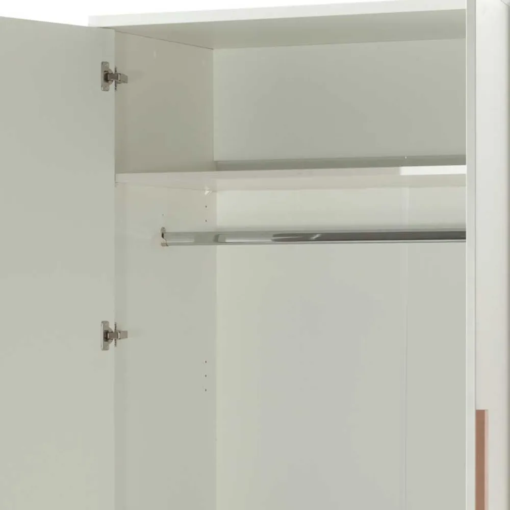 Der 2-türige Kleiderschrank sorgt für Ordnung in Ihrem Jugendzimmer. Die robusten Metallbeschläge an den Türen halten sie sicher am Schrankkorpus. Hinter den Türen verbirgt sich ein Innenraum mit einer Breite von 93 cm und einer Tiefe von 53 cm. Dieser bietet eine Kleiderstange aus Metall und zwei feste Böden, um Ihre Kleidung ordentlich zu organisieren. Der Platzbedarf für das Aufstellen des Kleiderschranks beträgt 99 cm in der Breite, 195 cm in der Höhe und 56 cm in der Tiefe.