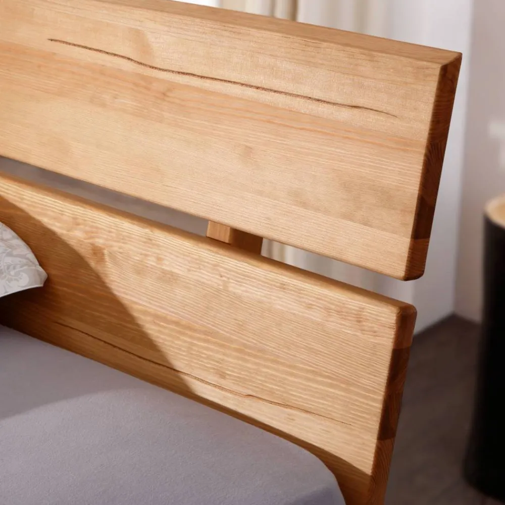 Das zweigeteilte Kopfteil des Bettes ist ein absoluter Blickfang. Aus dem Stamm geschnitten und mit echter Baumkante versehen, wird jedes Kopfteil zum Einzelstück. Diese natürliche Baumkante bringt die Schönheit der Natur direkt ins Schlafzimmer und verleiht dem Balkenbett einen rustikalen Touch. Die Halterungen aus Holz verstärken den natürlichen Look und sorgen für maximale Stabilität.