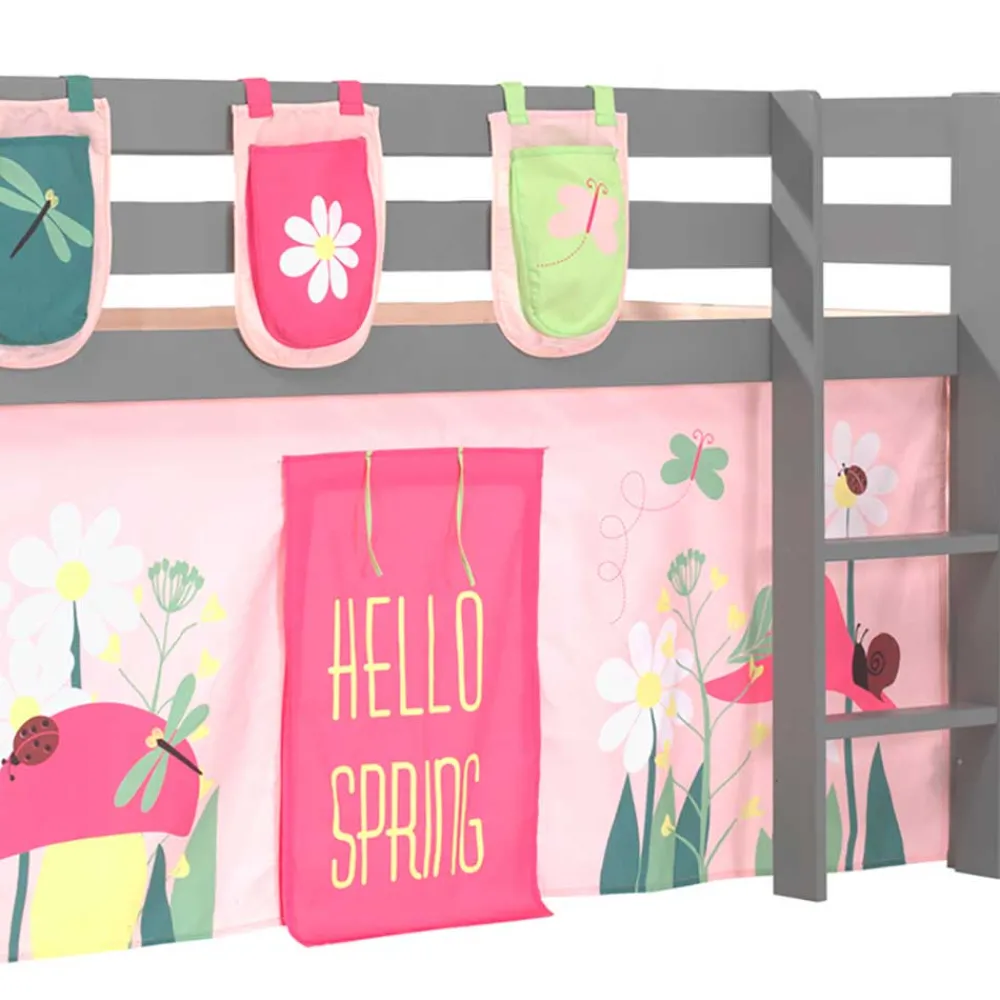 Wohnen Kindermöbel|Kinderbetten*Graues Massivholz-Hochbett mit Vorhang & Taschen – Corsica