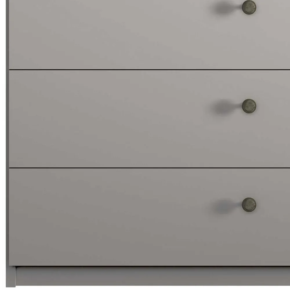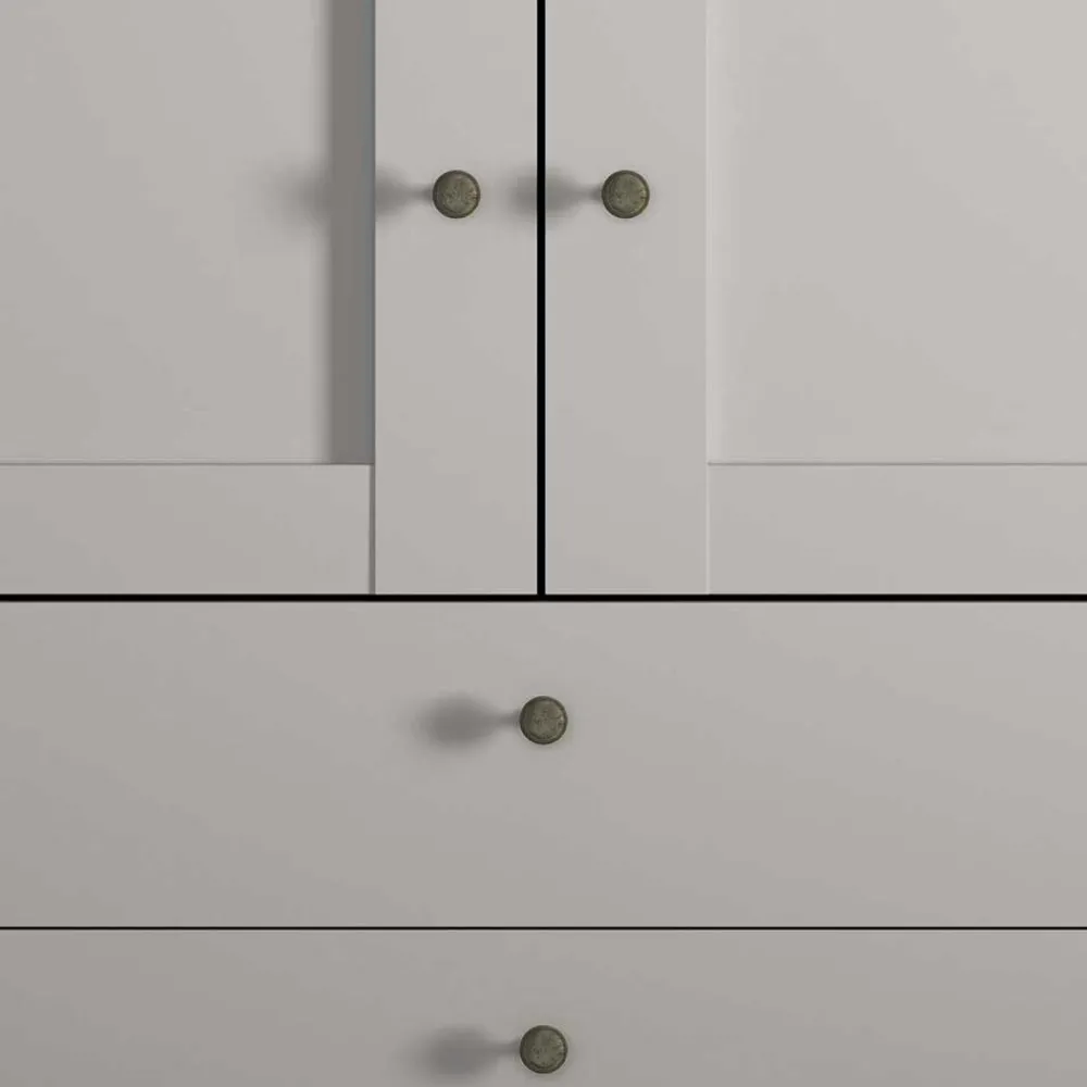 Die runden Metall-Knopfgriffe in Altsilberfarben an den Türen und Schubladen setzen stilvolle Akzente und runden das Gesamtbild des Kleiderschranks harmonisch ab.