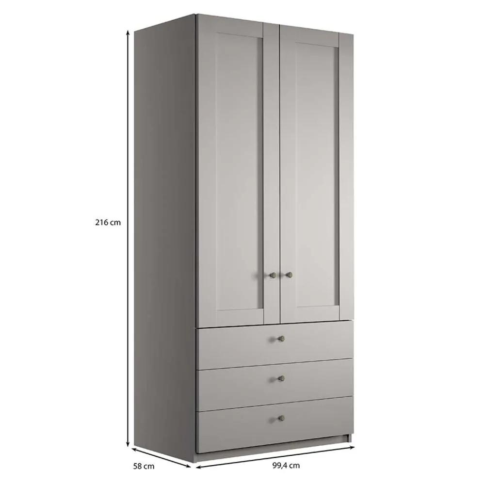 Mit einer Breite von 100 cm, einer Höhe von 216 cm und einer Tiefe von 58 cm bietet der Schrank viel Platz für Ihre Garderobe. Die zwei Drehtüren sind mit einer Soft-Close-Funktion und Metallbeschlägen ausgestattet. Diese sorgen für ein sanftes und leises Schließen der Türen. Besonderes Highlight: Die Türfronten in dezenter Kassettenoptik. Im Inneren des Schrankes erwartet Sie ein Fachelement mit einer Breite von 96,4 cm, das mit zwei Einlegeböden und einer Kleiderstange ausgestattet ist, ideal für Anzüge, Kleider oder Blusen. Für zusätzlichen Stauraum sorgen drei geräumige Schubkästen mit Metallauszug, die leichtgängig Ihre Accessoires oder Unterwäsche beherbergen.