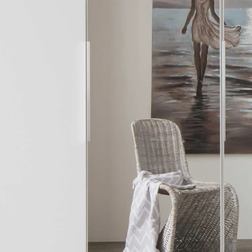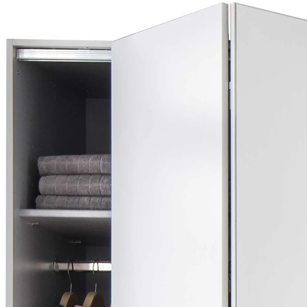 Die Außenseiten des Schranks sind mit praktischen Falttüren ausgestattet, während die mittlere Sektion eine Drehtür aufweist. Diese Kombination ermöglicht Ihnen einen schnellen und einfachen Zugriff auf Ihre Garderobe. Zudem sind die mittleren drei Türfronten mit großzügigen Ganzkörperspiegeln versehen, die nicht nur funktional sind, sondern auch Ihren Raum optisch vergrößern und mehr Helligkeit schaffen.