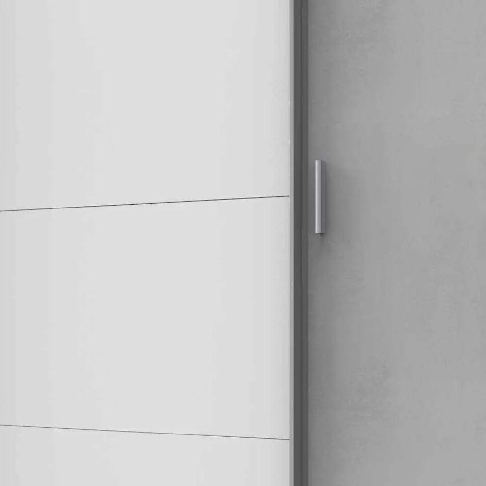 Der Kleiderschrank „Viganno“ bietet eine praktische Unterteilung mit großem Stauraumangebot. Mittig befinden sich zwei leichtgängige Schwebetüren in Weiß, die sich dank handlicher Metallgriffleisten in Alufarben bequem öffnen und schließen lassen. Außen befinden sich zwei graue Drehtüren mit stabilen Metallbeschlägen und kurzen Kunststoff-Griffleisten, die den modernen Look unterstreichen. Diese Kombination aus Schwebetüren und Drehtüren ermöglicht einen flexiblen Zugang und eine optimale Raumnutzung.