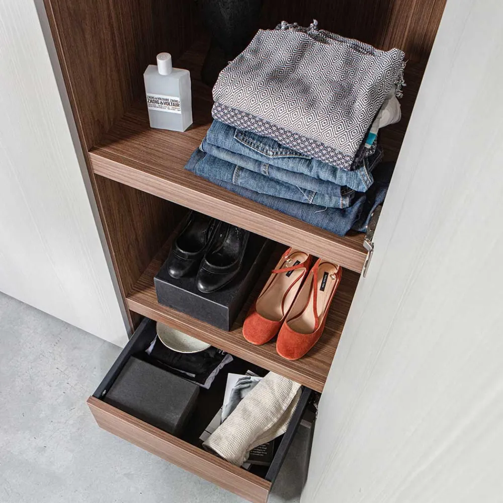 - Ein 53 cm breites Element mit drei höhenverstellbaren Einlegeböden, ideal für Pullover, Taschen und Boxen