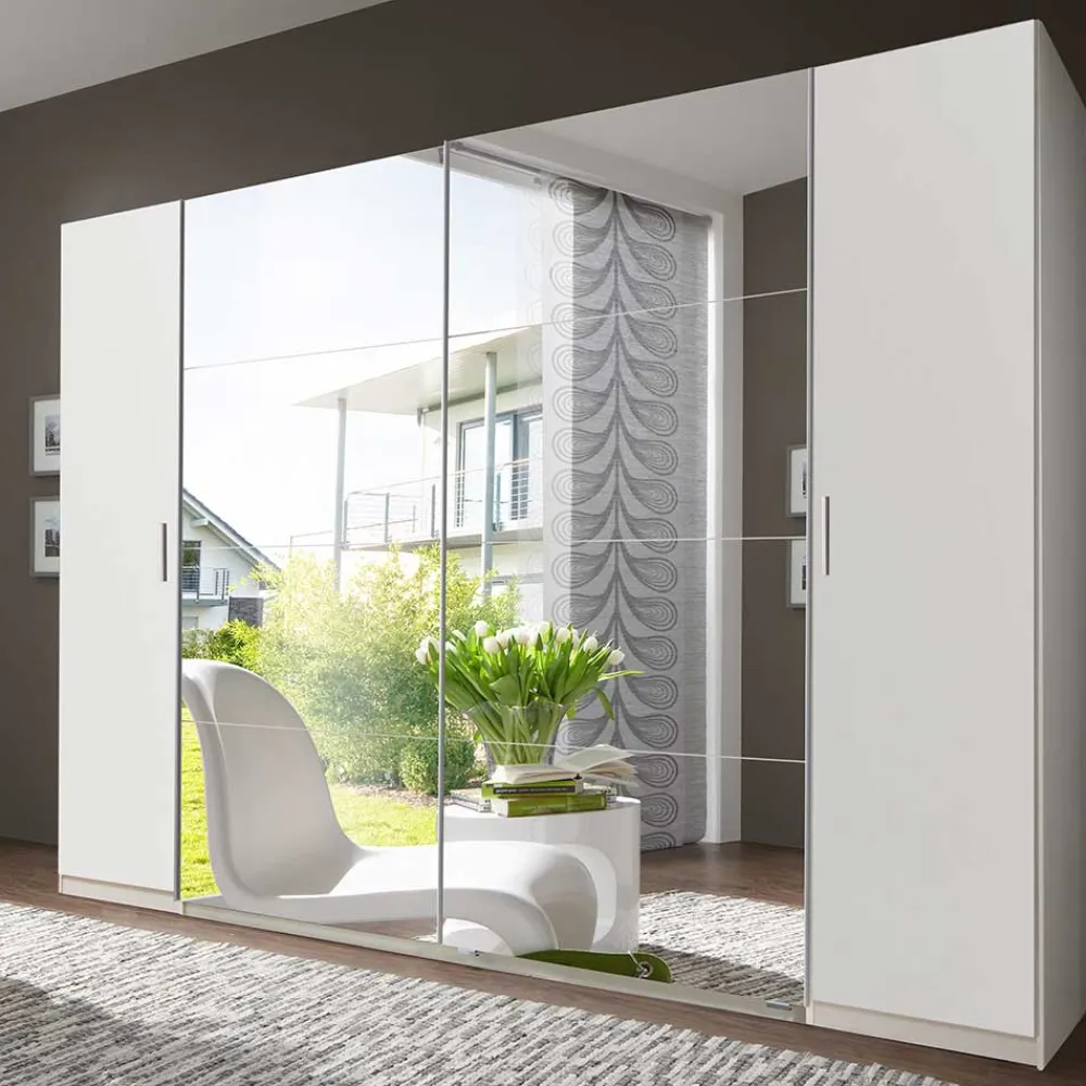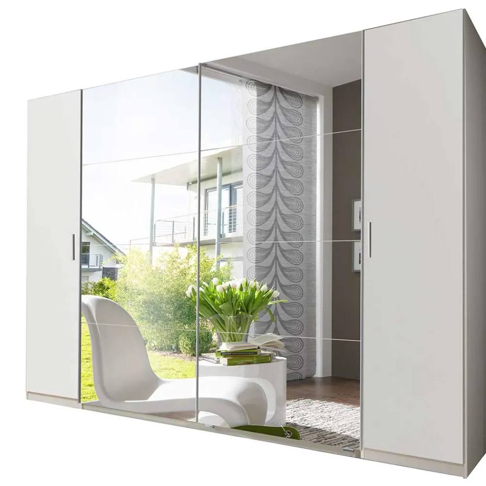 Der Kleiderschrank „Denada“ verfügt über zwei leichtgängige Schwebetüren in der Mitte, die mit großzügigen Ganzkörperspiegeln versehen sind. Diese Spiegel sind nicht nur praktisch für Ihre tägliche Garderobenwahl, sondern lassen den Raum auch größer und heller wirken. Die Außentüren sind Drehtüren mit stabilen Metallbeschlägen, die eine lange Lebensdauer garantieren. Die handlichen Metallgriffleisten in Alufarben an den Schwebetüren und die kurzen Kunststoff-Griffleisten an den Drehtüren unterstreichen den modernen Look und erleichtern das Öffnen und Schließen der Türen.