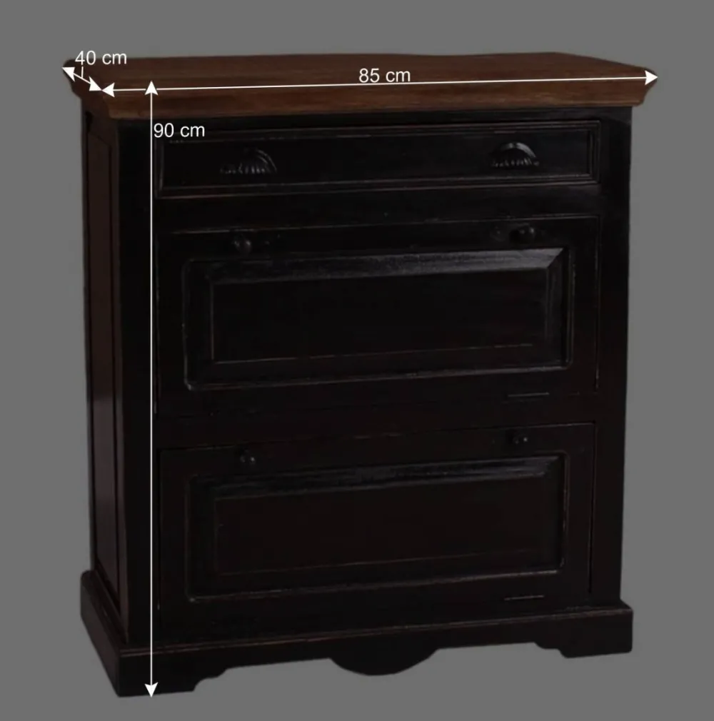 Das Design besticht durch seinen Kontrast: Die schwarzen, lackierten Oberflächen mit Antik Finish werden durch honigfarbige Deckplatten aus Massivholz effektvoll hervorgehoben. Dieser optische Akzent sorgt für einen reizvollen Blickfang in Ihrem Eingangsbereich.