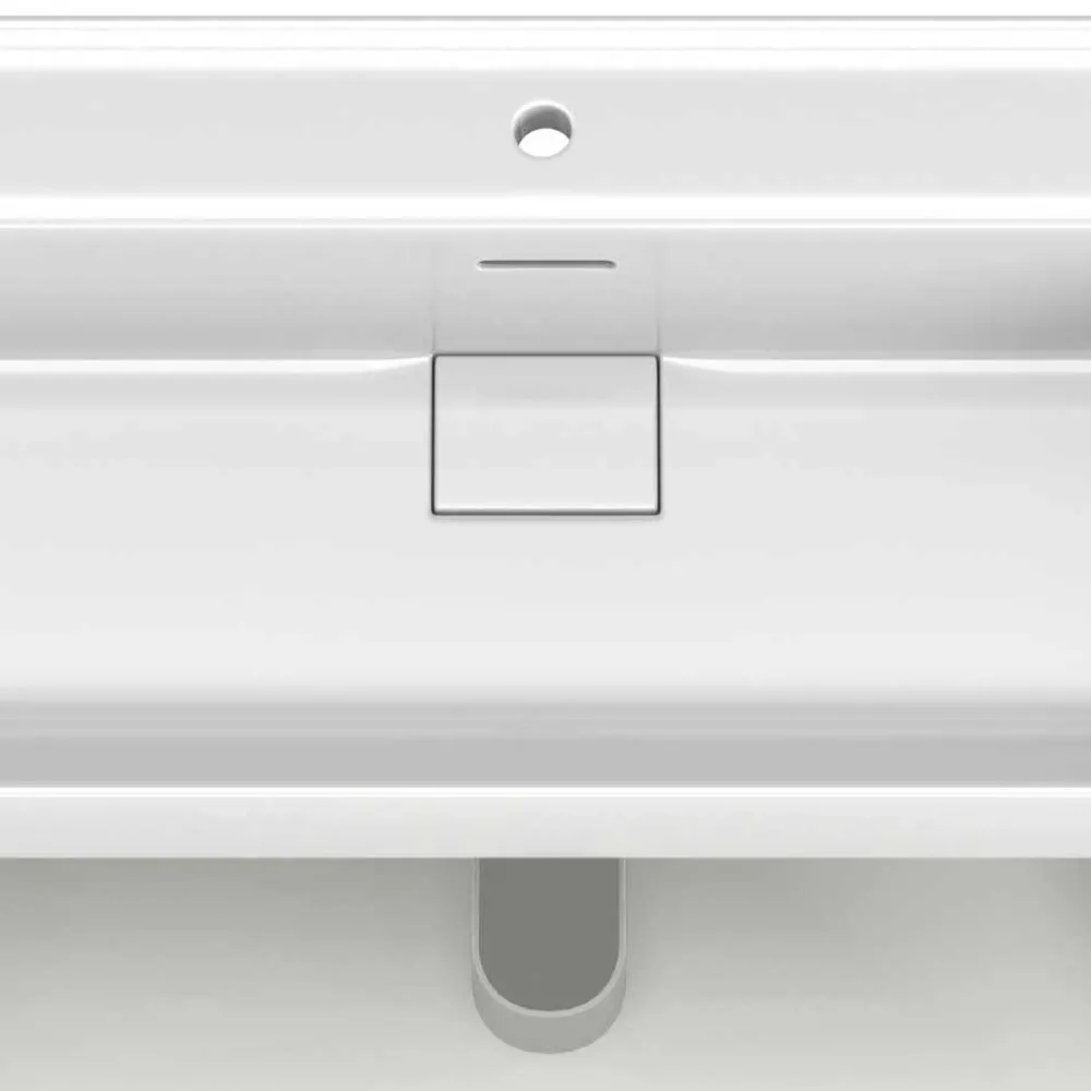 Abgerundet wird das Ensemble durch das hochwertige Einsatzwaschbecken aus weißer Keramik. Mit einer Breite von 99,8 cm, einer Höhe von 18,5 cm und einer Tiefe von 46,8 cm bietet es eine großzügige Fläche, die sowohl optisch als auch funktional überzeugt. Die glatte Oberfläche erleichtert die Reinigung und sorgt für langanhaltende Schönheit.