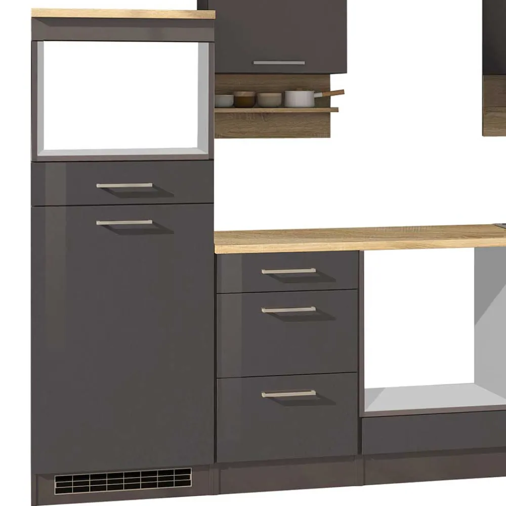 - Front grau Hochglanz foliert, Korpus grau melaminbeschichtet, Wandboards, Arbeits- und Ablagefläche in Holzoptik Sonoma Eiche