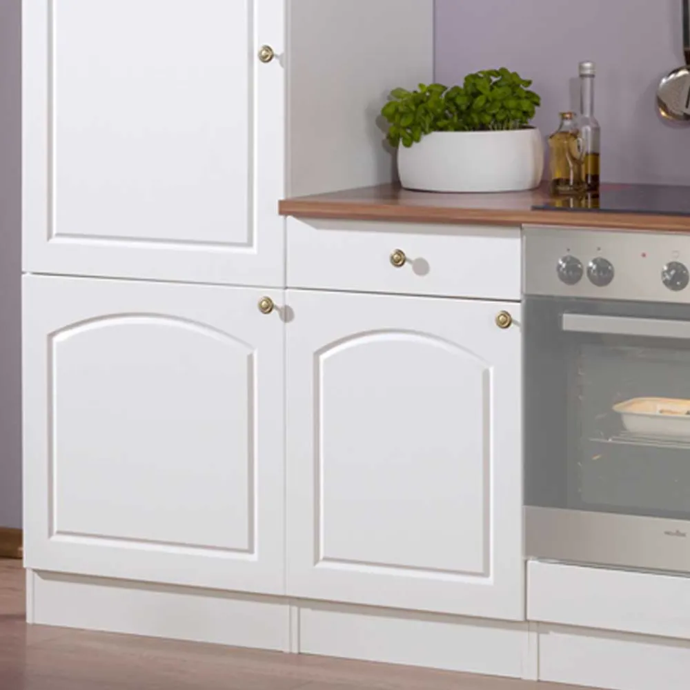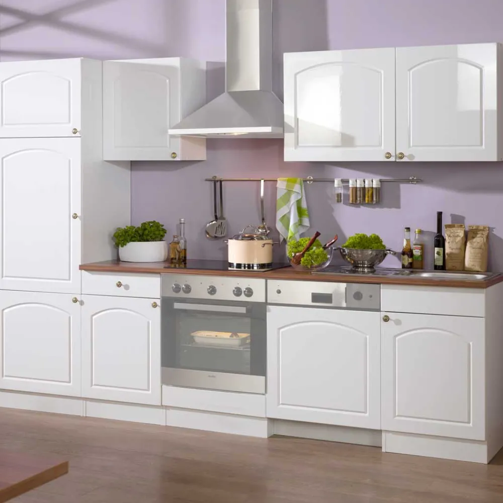 Mit einer Breite von 280 cm, einer Höhe von 200 cm und einer Tiefe von 60 cm bietet die Küchenzeile „Lore“ ausreichend Platz für Ihre Küchengeräte und Utensilien. Das Set besteht aus zwei Hängeschränken, einem Unterschrank, einem Herdumbauschrank, einem Spülenschrank mit integriertem Einbaubecken sowie einem Kühlumbauschrank. Zusätzlich bietet die 220 cm lange Arbeitsplatte mit einer Stärke von 28 mm im eleganten Nussbaum-Dekor einen stilvollen und warmen Kontrast zu den weißen Hochglanzfronten. Der Hauch von Landhausstil, der durch die schönen Tor-Rillenfräsungen entsteht, verleiht Ihrer Küche eine gemütliche, einladende Atmosphäre.