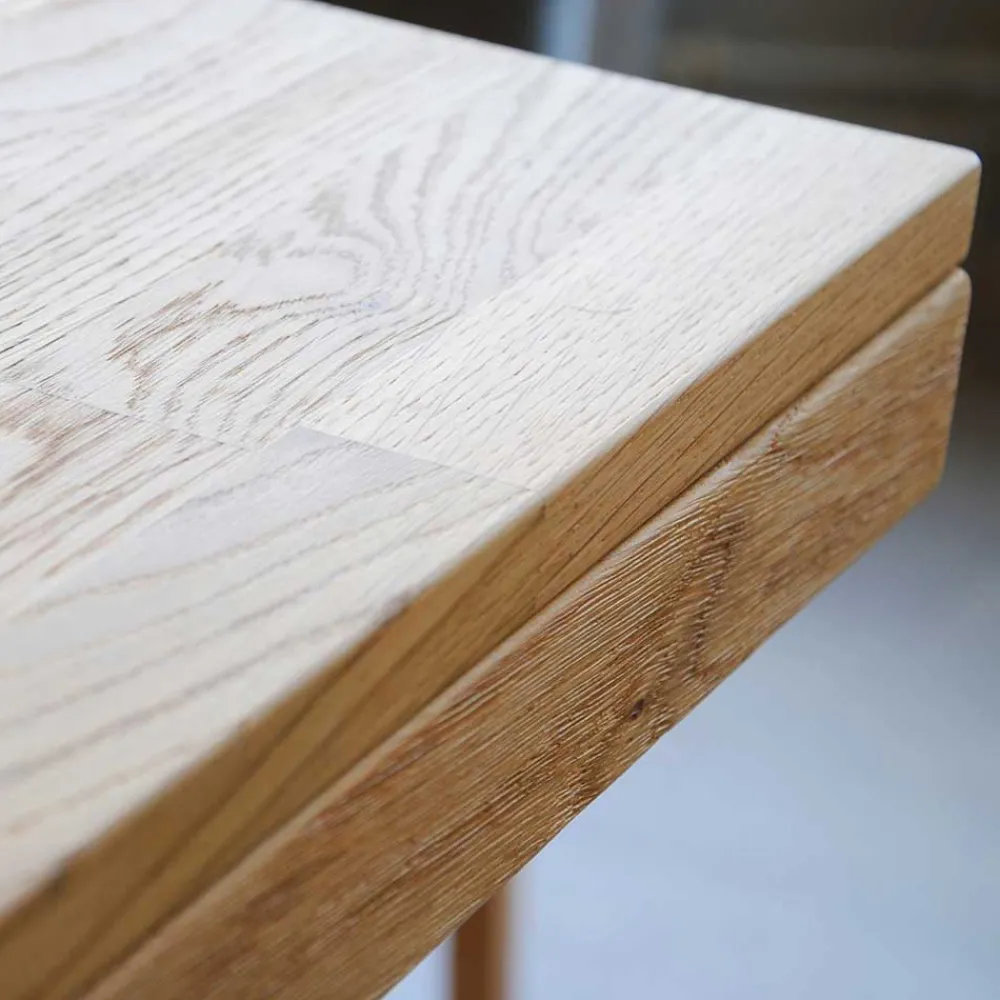 - Massive Eiche Tischplatte mit einer Stärke von ca. 1,8 cm, am Rand aufgedoppelt auf ca. 4 cm