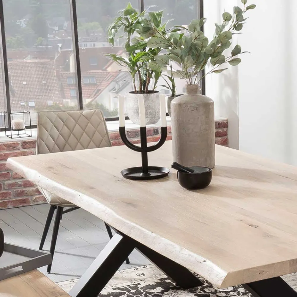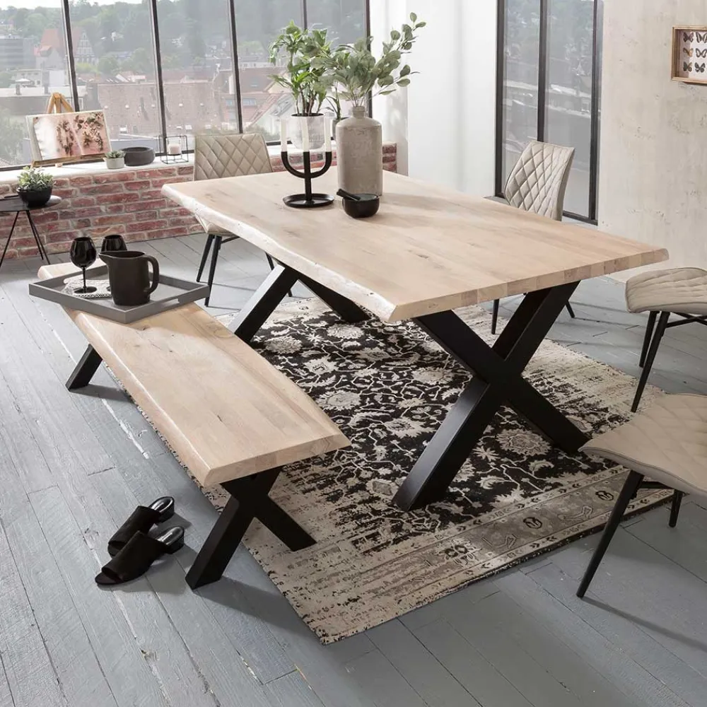 Die Tischplatte wurde aufgedoppelt, um die Stabilität und Langlebigkeit zu maximieren. Mit einer Stärke von etwa 2 cm und einem Rand von rund 4,5 cm überzeugt die Platte nicht nur durch ihre Stabilität, sondern auch durch ihre visuelle Präsenz. Die Kombination von massiven Holzplatten und einem stabilen X-förmigen Metallgestell verleiht dem Tisch eine moderne, dennoch rustikale Ausstrahlung, die perfekt in jedes moderne Zuhause passt.