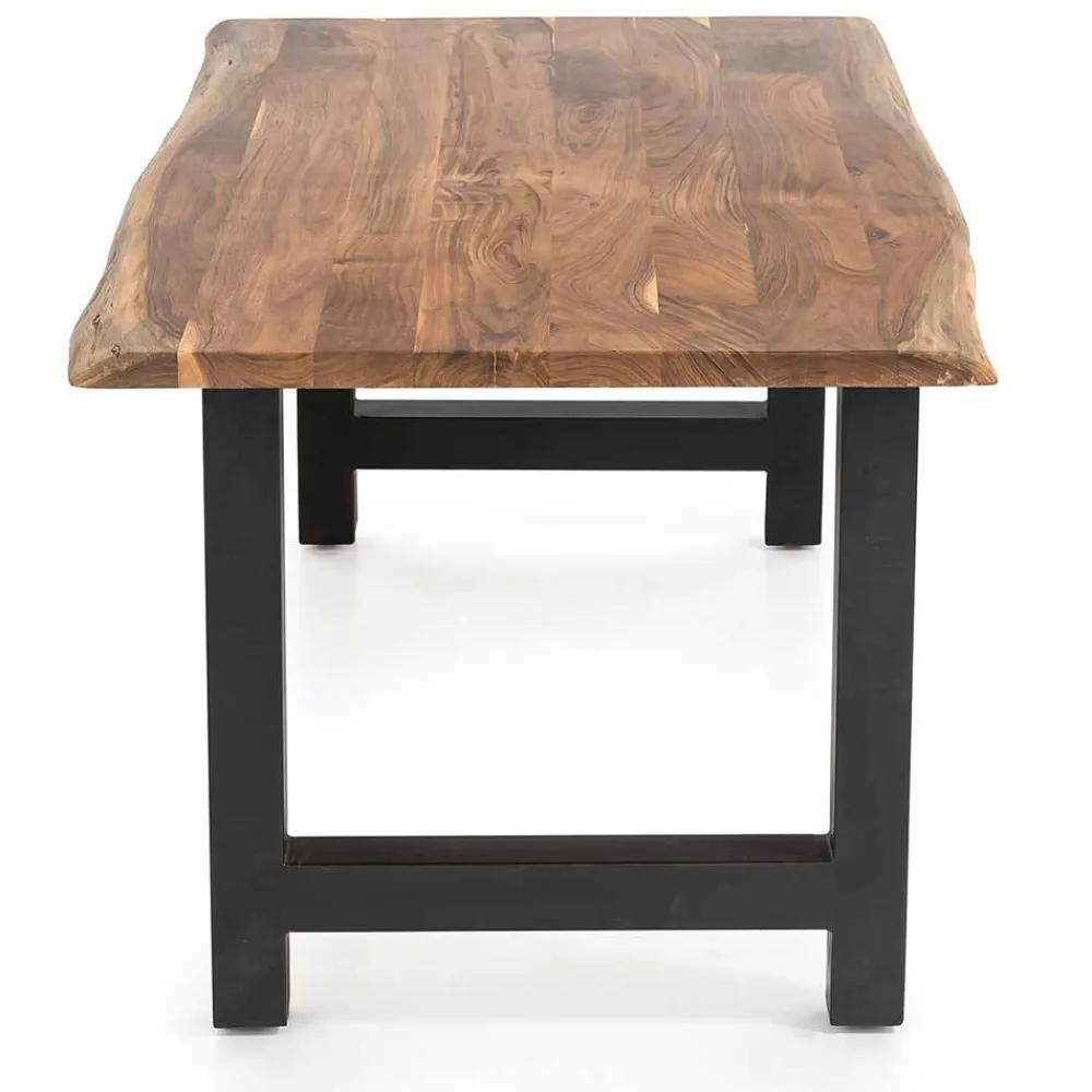 Die Tischplatte aus massivem Akazienholz beeindruckt mit einer Stärke von etwa 3,5 cm – ein echtes Statement. Geschnitten direkt aus dem Stamm und belassen mit ihrer natürlichen Baumkante, erzählt jedes Stück seine ganz eigene Geschichte. Diese Kante, unregelmäßig und organisch gewachsen, verleiht dem Tisch einen natürlichen, ursprünglichen Charme. Sie steht sinnbildlich für Individualität, Naturverbundenheit und echtes Handwerk.