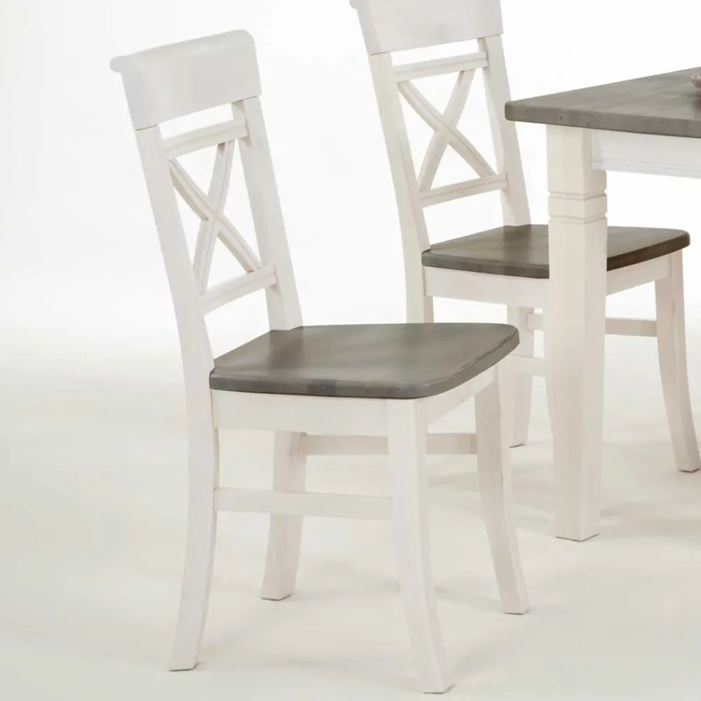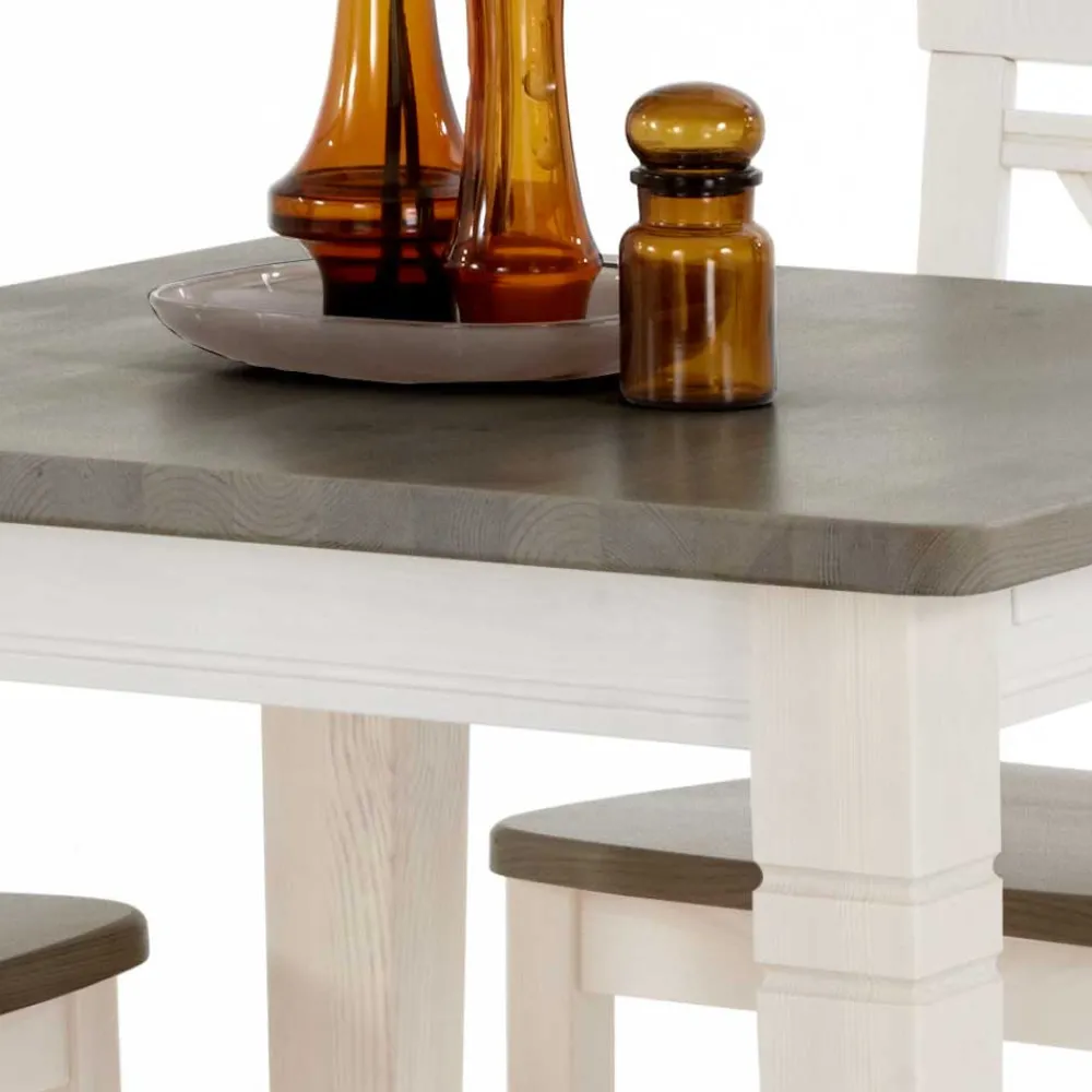 Die Kombination aus weiß lackierten Flächen und graubeizten, lackierten Tisch- und Sitzflächen macht die Esstischgruppe zu einem echten Blickfang. Die durchscheinende Holzmaserung sorgt für eine authentische, natürliche Optik und unterstreicht den gemütlichen Charakter des Landhausstils. Die helle Farbgestaltung lässt den Essbereich freundlich und einladend wirken und lässt sich wunderbar mit verschiedenen Wohnstilen kombinieren.