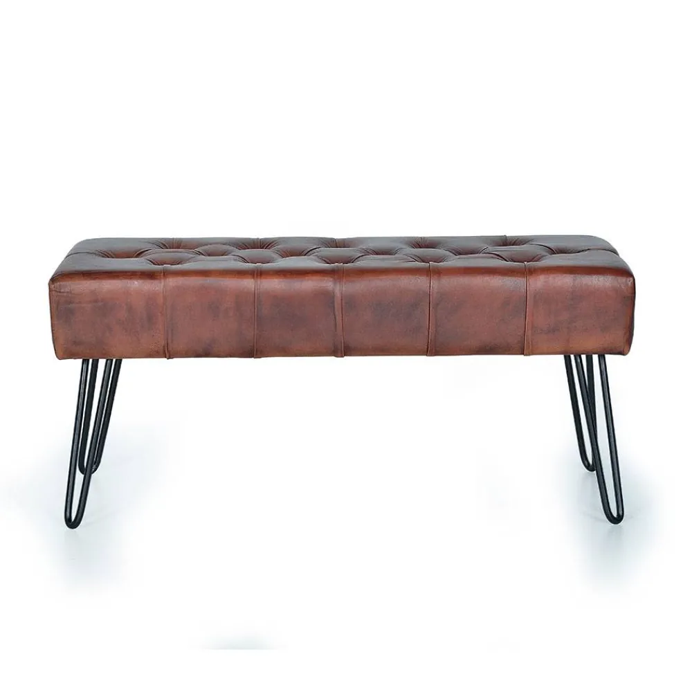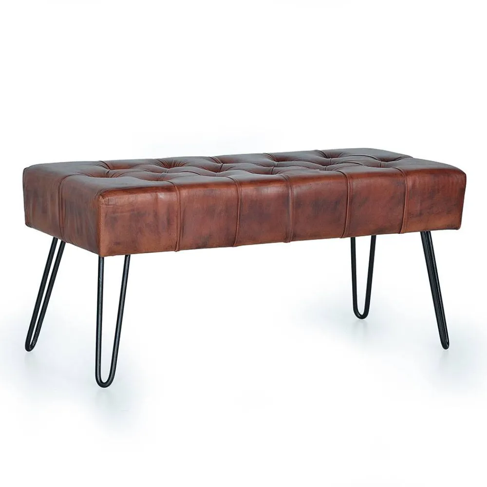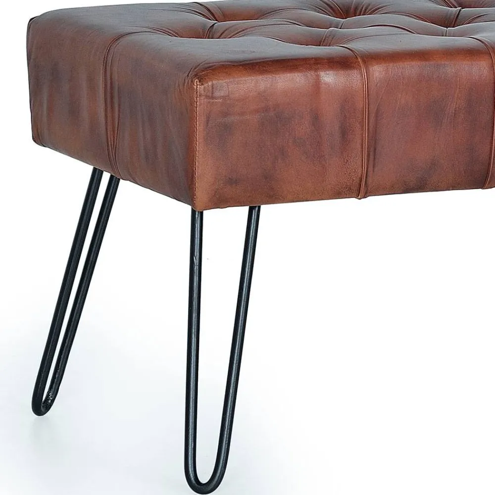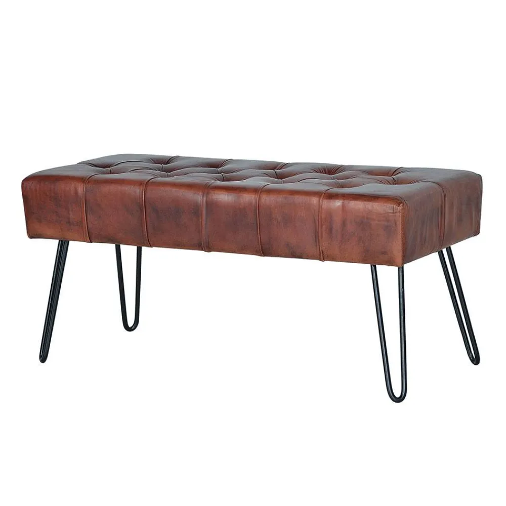 Der Bezug der Sitzfläche besteht aus hochwertigem Echtleder, das mit seiner lebendigen Struktur und der Vintage-Optik für eine ansprechende Patina sorgt. Die sichtbaren Naturmerkmale des Leders machen jedes Exemplar zu einem Unikat und verleihen dem Möbelstück einen authentischen, individuellen Charakter. Die stabilen Metallbeine in schwarzer Haarnadel-Form ergänzen den natürlichen Look um ein modernes, leichtes Design.