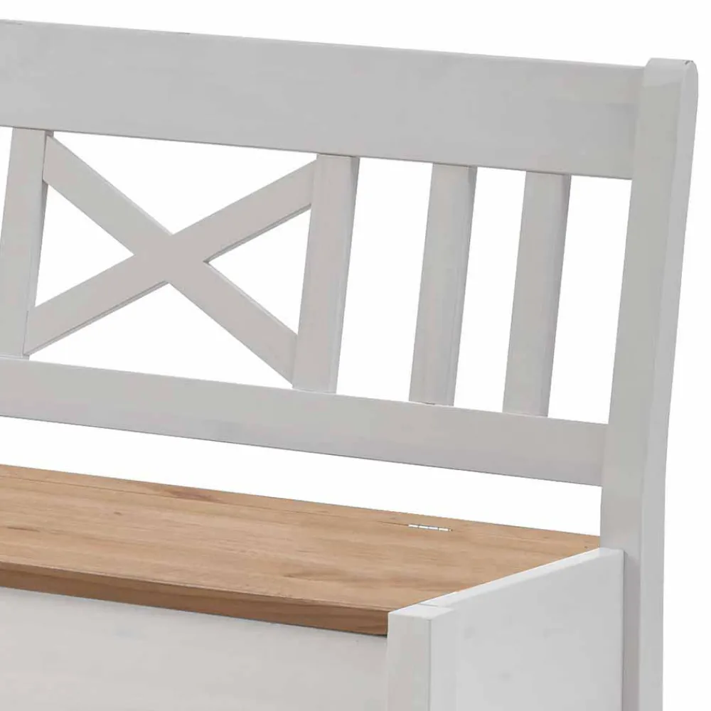 Entdecken Sie die Truhen Eckbank Lugon, eine stilvolle Sitzgelegenheit, die Ihren Essbereich im charmanten Skandi Landhaus Chic erstrahlen lässt.