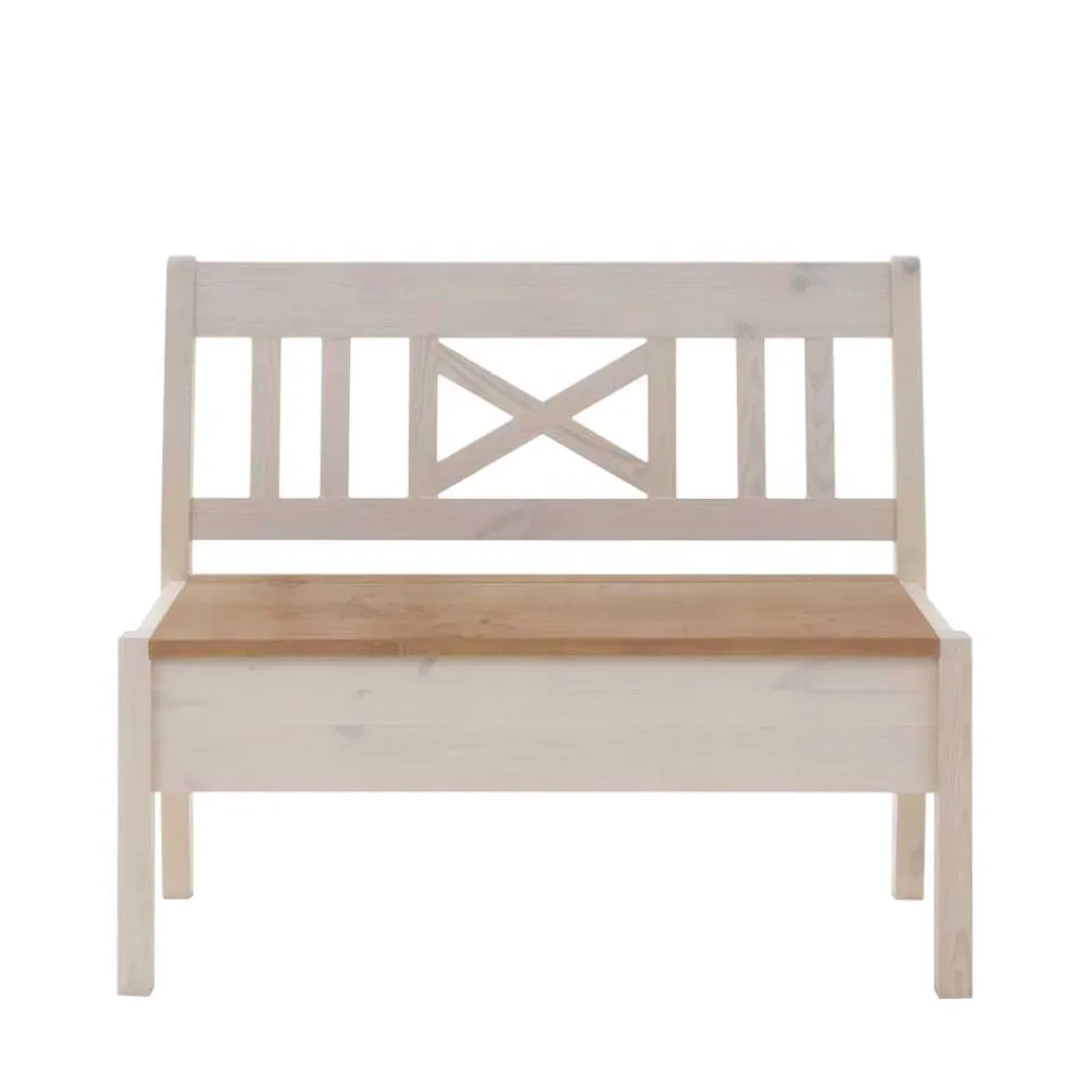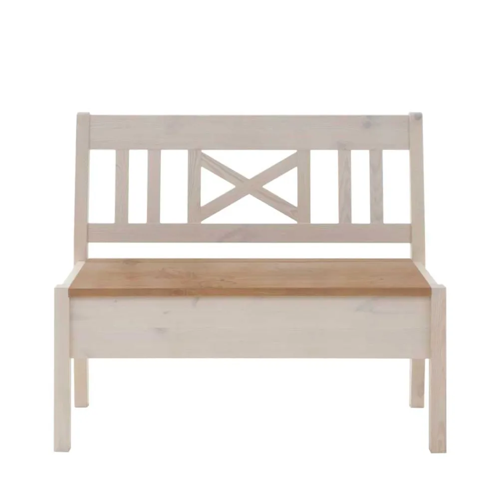 Entdecken Sie die Truhenbank Lugon – Ihre praktische Sitzgelegenheit, die bezaubernden Landhausflair in jeden Wohnraum bringt. Der attraktive Farbkontrast aus strahlendem Weiß und warmem Kiefer Laugenfarbig verleiht Ihrem Zuhause eine einladende und gemütliche Atmosphäre.
