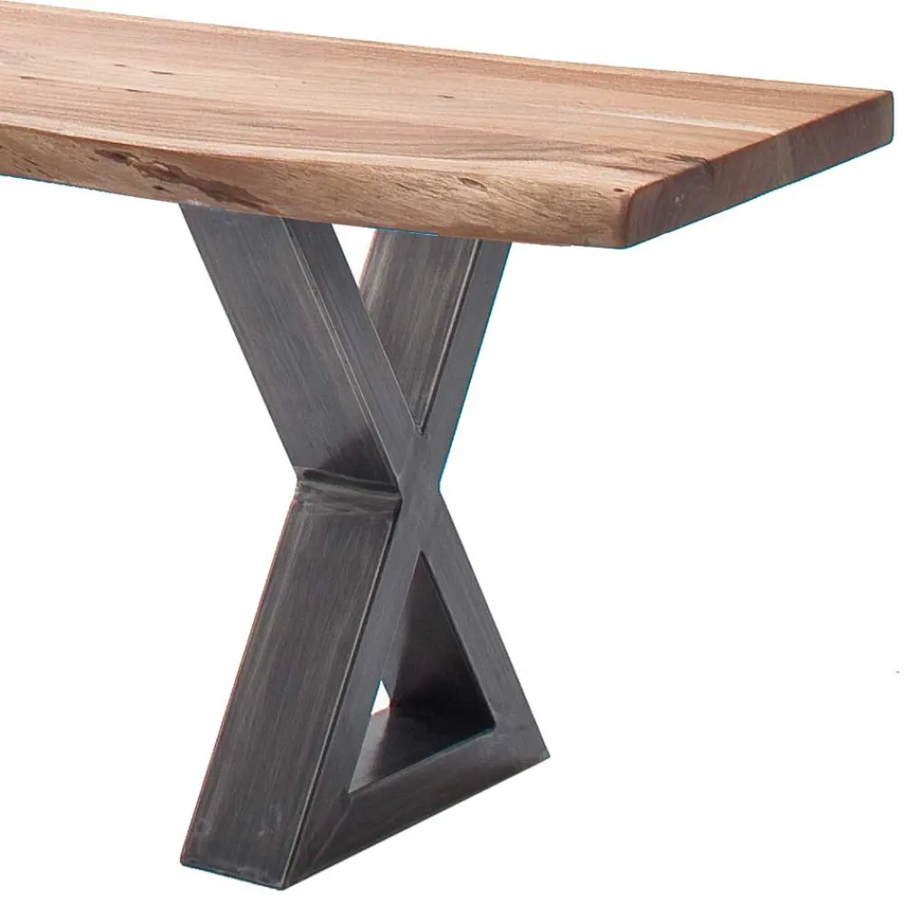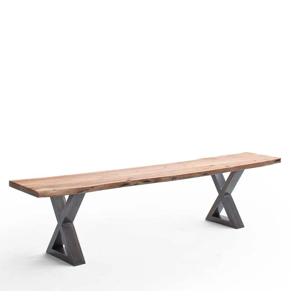 Die stilvollen X-Beine aus Metall ergänzen das Design perfekt und bieten eine stabile Grundlage. Die Beine sind in einem Antik-Look gewischt und in Altsilber gehalten, was einen attraktiven Kontrast zum naturbelassenen Holz schafft. Diese durchgehende Bodenauflage sorgt für zusätzliche Stabilität und verleiht der Bank einen robusten, industriellen Touch.
