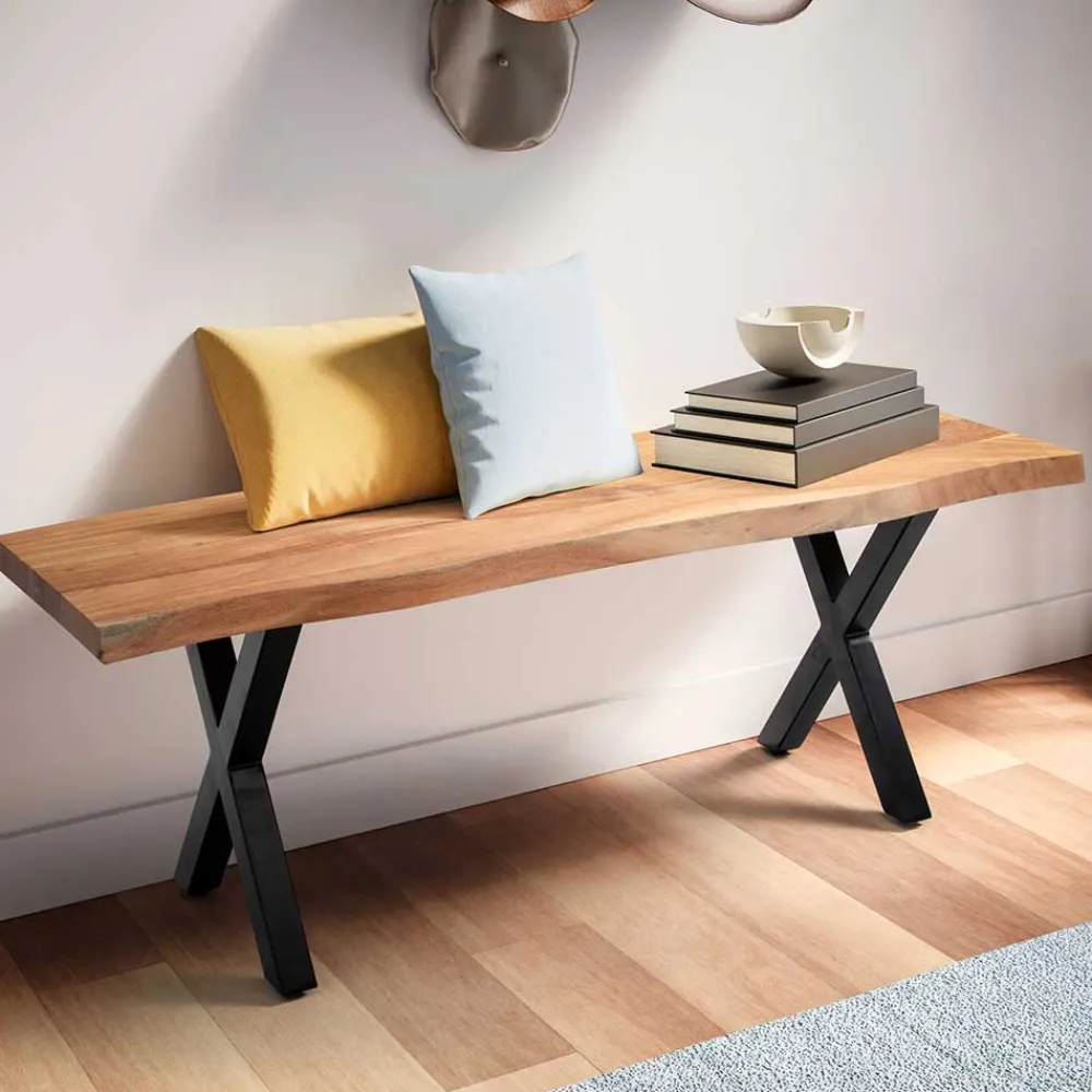 Die Sitzfläche der „Nariosca“ Garderobenbank besteht aus massivem Akazienholz. Besonders beeindruckend ist die unregelmäßige Baumkante, die das Holz auszeichnet – als wäre es direkt aus dem Stamm geschnitten. Diese einzigartige Optik wird durch eine schützende Lackierung perfekt in Szene gesetzt, die zudem für eine langlebige und pflegeleichte Oberfläche sorgt. Das robuste Untergestell aus schwarzem Metall, geformt in einem markanten X-Design, bietet nicht nur Stabilität, sondern ergänzt den natürlichen Charme des Holzes durch einen modernen, industriellen Touch.