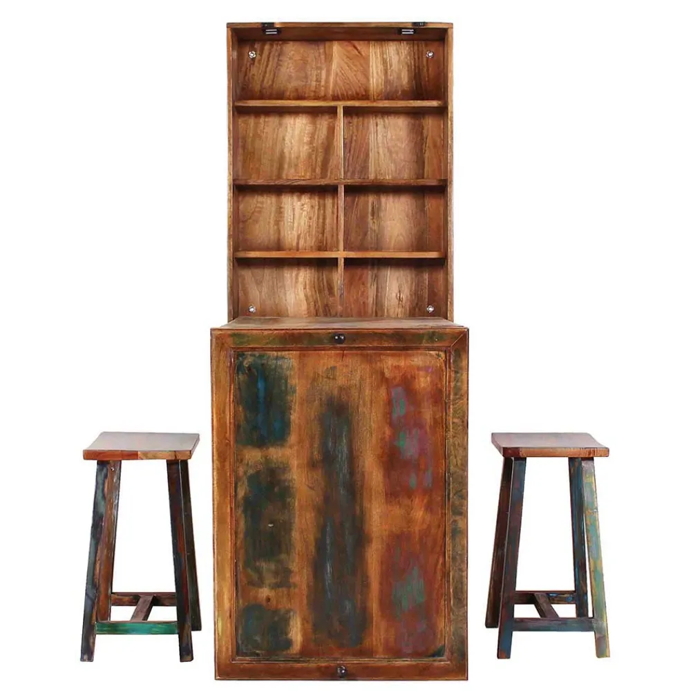 Die starken Gebrauchsspuren auf dem Holz sind gewollt und verleihen jedem Möbelstück einen einzigartigen Charakter. Jede Holzoberfläche ist in verschiedenen bunten Farben mit Farbresten lackiert, was einen lebendigen und dynamischen Eindruck schafft. Das Ergebnis ist ein Möbelstück, das nicht nur funktional ist, sondern auch als Kunstwerk in Ihrer Küche oder Ihrem Partyraum dienen kann.