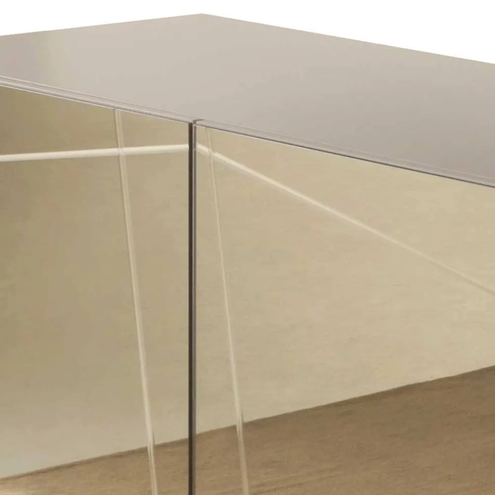Das Sideboard „Lotivera“ besteht aus einer hochwertigen Kombination von Spiegelglas, MDF und Metall. MDF (Mitteldichte Faserplatte) ist ein vielseitiges Material, das sich durch seine hohe Festigkeit und Formstabilität auszeichnet. Es ist resistent gegen Verformungen und eignet sich hervorragend für die Herstellung von Möbeln, die langlebig und robust sein sollen. Die taupe melaminbeschichtete Korpus-Oberfläche ist pflegeleicht und widerstandsfähig gegen Kratzer und Stöße. Die Front des Sideboards ist mit bronzefarbigem Spiegelglas beschichtet, das nicht nur edel aussieht, sondern auch den Raum optisch vergrößert und für eine helle, freundliche Atmosphäre sorgt.