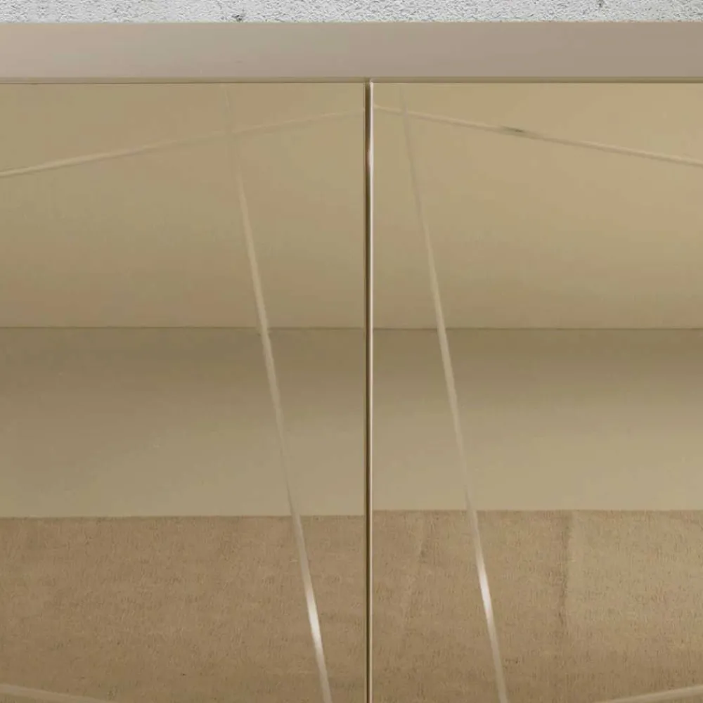 Das dekorativ eingravierte grafische Muster auf der Front des Sideboards verleiht dem Möbelstück eine individuelle Note und macht es zu einem echten Unikat. Diese kunstvolle Gravur zieht alle Blicke auf sich und unterstreicht den exklusiven Charakter des Sideboards. In Kombination mit der bronzefarbenen Spiegelglas-Front entsteht ein faszinierendes Spiel von Licht und Reflexionen, das Ihren Wohnraum in ein stilvolles Ambiente taucht.