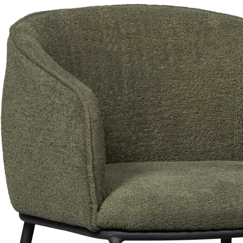 Für den Bezug des Sessels wurde strapazierfähiges Bouclé verwendet, das aus 100 % Polyester gefertigt ist. Das Material ist nicht nur angenehm weich, sondern auch besonders robust und pflegeleicht. Die gemütliche Schaumstoffpolsterung sorgt für hervorragenden Sitzkomfort – perfekt für längere Sitzphasen. Das Metallgestell in Schwarz, pulverbeschichtet, garantiert Stabilität und einen modernen Look. Die eleganten Armlehnen und die attraktive Rückenlehne in runder Cocktailform bieten zusätzlichen Komfort und runden das Design ab.