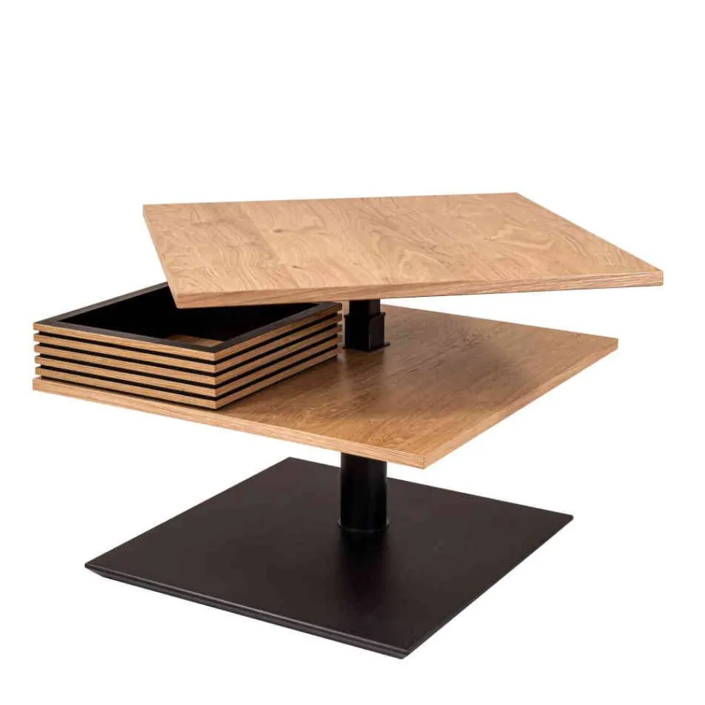 Nicht nur in der Optik, sondern auch in der Funktionalität punktet der „Portland“. Die solide Tischplatte ist nicht nur robust, sondern bietet mit ihrer 360-Grad-Drehfunktion maximale Flexibilität. So haben Sie stets alles im Blick und griffbereit. Unterhalb der Tischplatte finden Sie eine offene Ablagefläche sowie einen integrierten Ablagekasten. Diese bieten Ihnen zusätzlichen Stauraum für Zeitschriften, Fernbedienungen oder andere Alltagsgegenstände – perfekt organisiert und stilvoll verstaut. Die elegante Rillenfräsung an der MDF-Ablage in Schwarz und Wildeiche furniert setzt dabei weitere designstarke Akzente.
