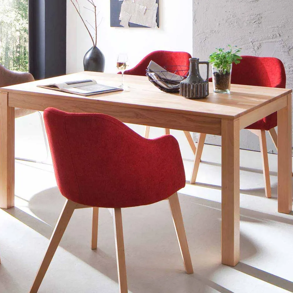 Die Tischplatte besteht aus robustem Kernbuche-Massivholz und ist ca. 2 cm stark. Sie ist mit einer strapazierfähigen Oberflächenlackierung versehen. Das stabile Vierfußgestell macht den Tisch zu einem verlässlichen Allrounder. Der Abstand vom Boden bis zur Zargenunterkante beträgt etwa 64,5 cm.