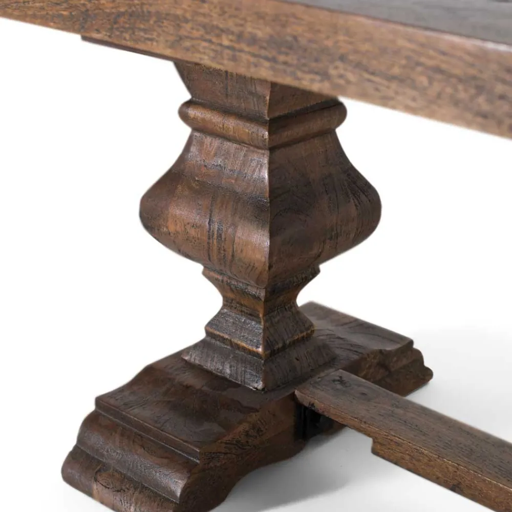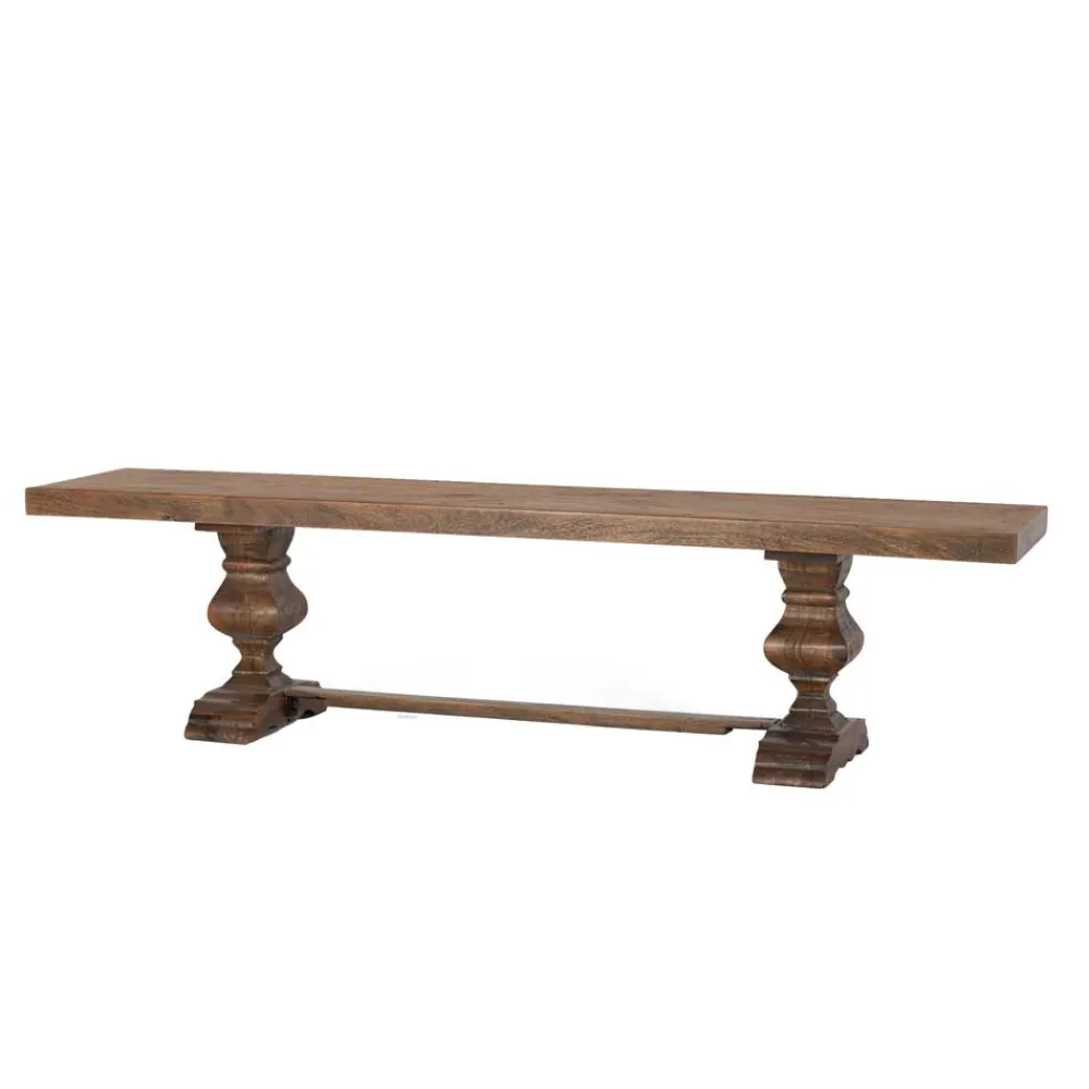 Die Bank besteht vollständig aus massivem Mangoholz, einem langlebigen und robusten Material, das für seine besondere Farbgebung und Struktur bekannt ist. Das gedrechselte Fußgestell mit zwei eleganten Säulen unterstreicht den charmanten Landhausstil und verleiht der Bank eine standfeste Basis. Durch die Handarbeit bei der Fertigung entstehen einzigartige Details, die jedes Stück zu einem Einzelstück machen.