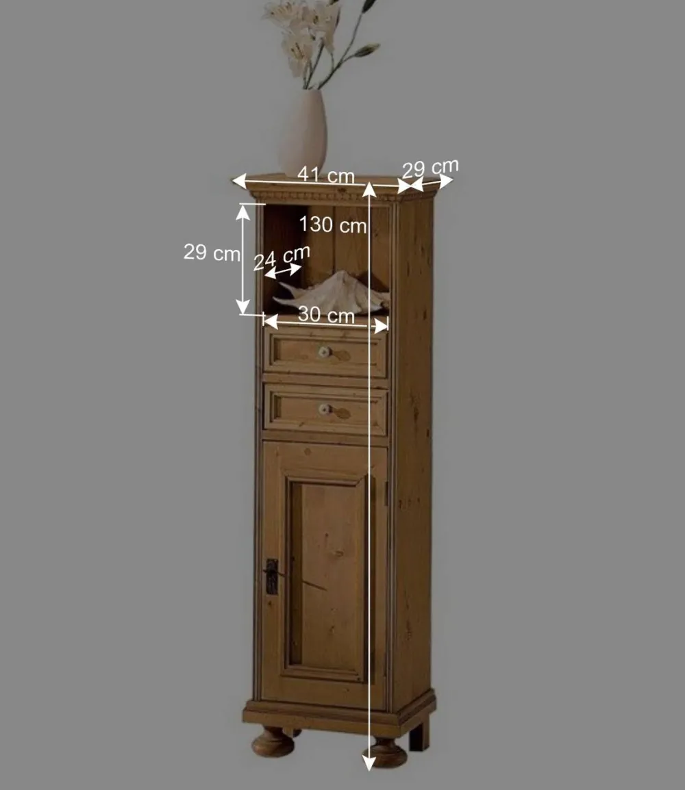 Mit ihren Maßen von 41 cm in der Breite, 130 cm in der Höhe und 29 cm in der Tiefe findet die „Melessa“ auch in der kleinsten Nische noch einen Platz. Doch lassen Sie sich von den kompakten Abmessungen nicht täuschen – diese Hochkommode bietet jede Menge Stauraum! Hinter der abschließbaren Drehtür in Kassettenoptik befindet sich ein großes Staufach ohne Inneneinteilung, ideal für Ihre persönlichen Schätze. Zusätzlich stehen Ihnen zwei Schubkästen mit Holzauszug zur Verfügung, die mit nostalgischen weißen Porzellanknöpfen verziert sind. Darüber hinaus bietet das offene Fach oberhalb der Schubkästen weitere Möglichkeiten zur Aufbewahrung. Die aufwändige Paneeloptik der Rückwand verleiht der „Melessa“ das gewisse Etwas.