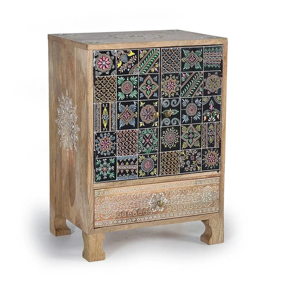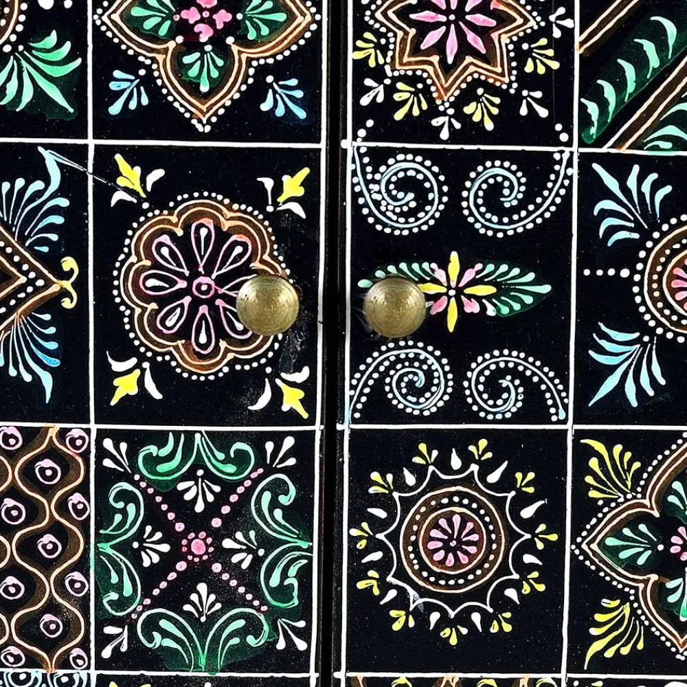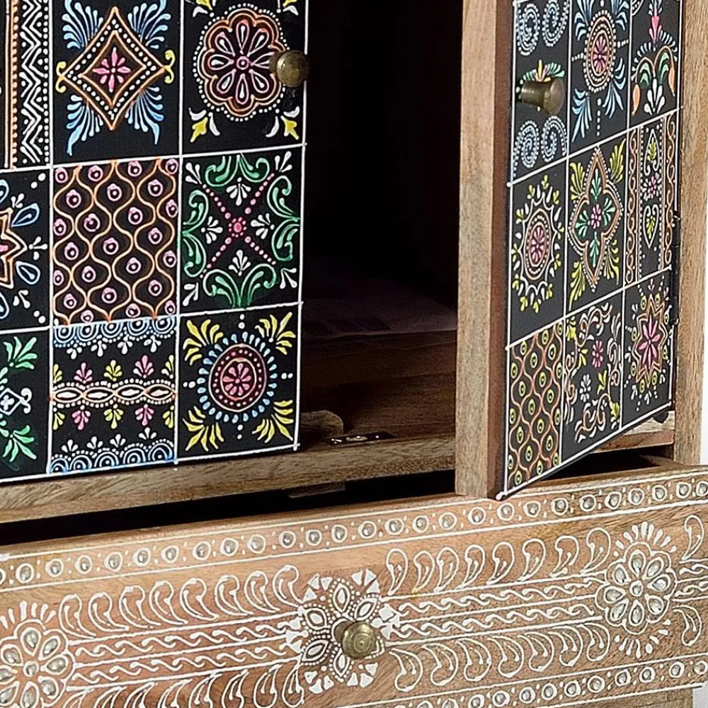 Dank seiner Herstellung aus hochwertigem Mangoholz bringt der Nachtschrank „Fenezian“ die natürliche Schönheit dieses Materials perfekt zur Geltung. Mangoholz ist bekannt für seine Stabilität und seine ausdrucksstarke Maserung, die durch die handgefertigten Verzierungen kunstvoll ergänzt wird. Jede Kommode ist ein Unikat – keine Maserung gleicht der anderen, und auch die handbemalten Ornamente sorgen für eine individuelle Gestaltung. Die Deckplatte, Seitenflächen und die Schubladenfront sind mit weißen Ornamenten und Mustern verziert, während die dunkel gehaltenen Türfronten durch feine weiße Linien optisch unterteilt werden. Jedes der dabei entstehenden Rechtecke wird von einem einzigartigen, farbenfrohen Muster geschmückt, das den handwerklichen Charakter des Möbelstücks betont.