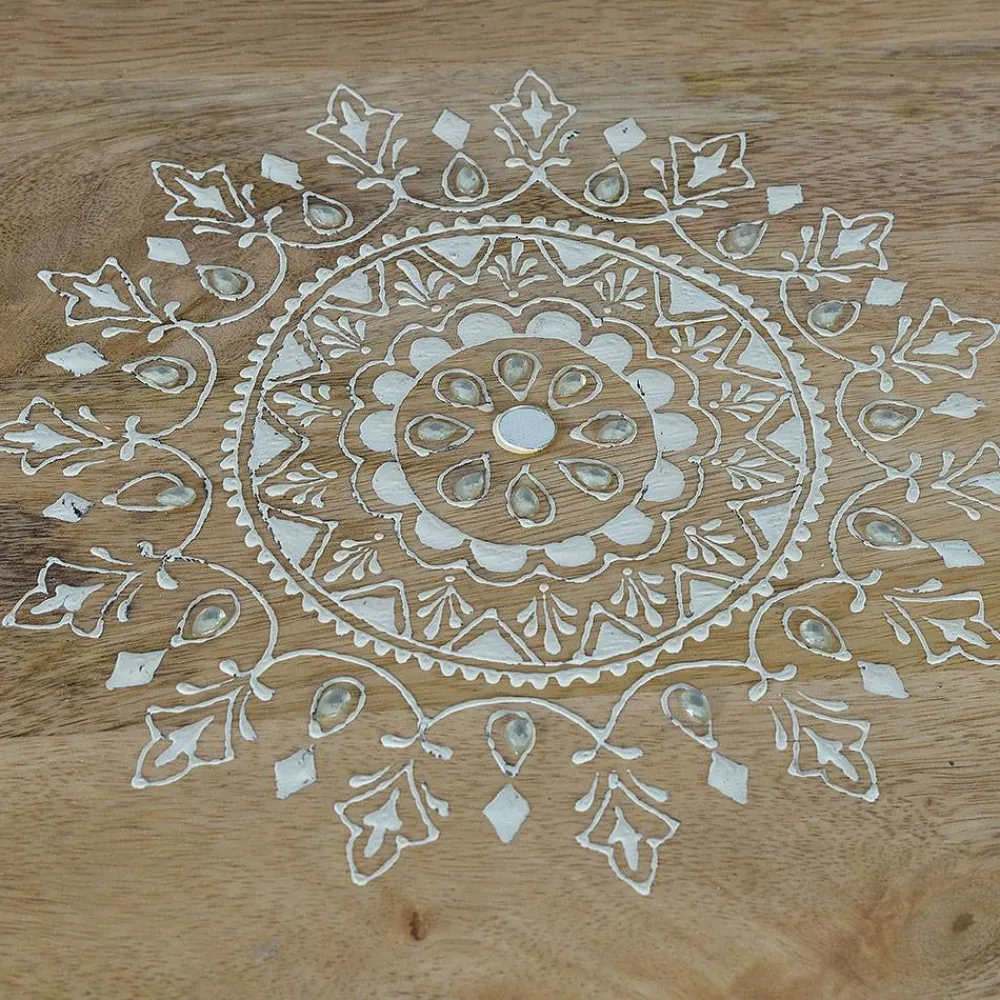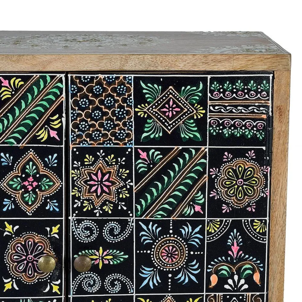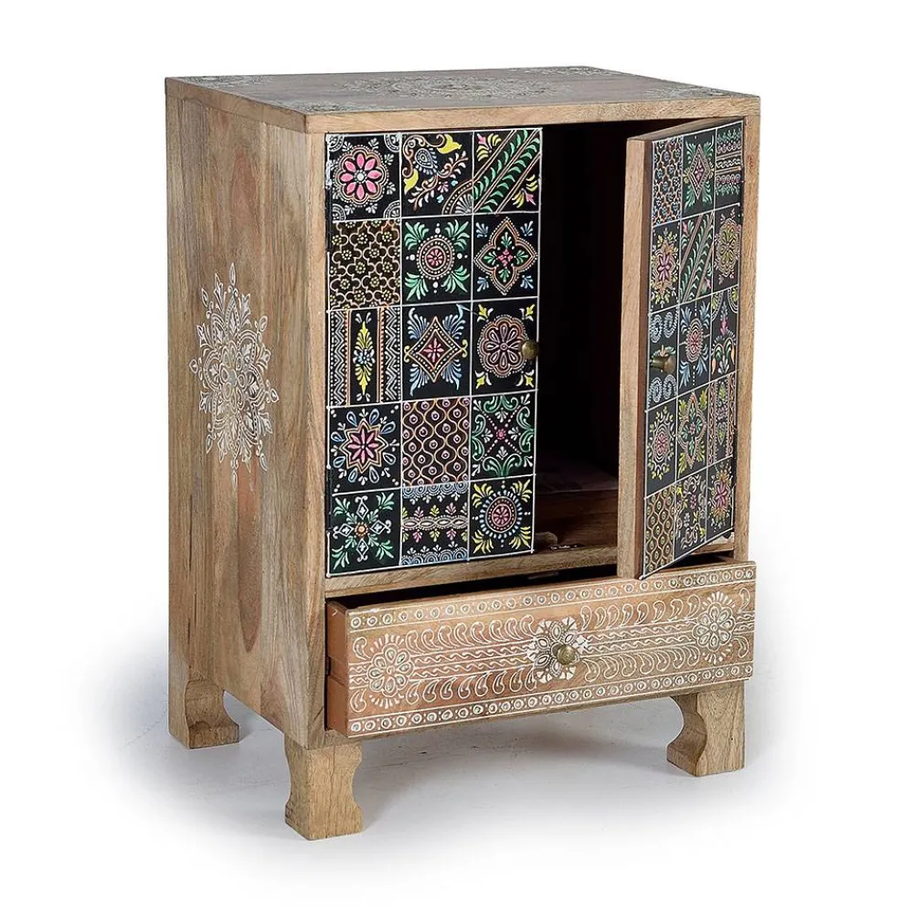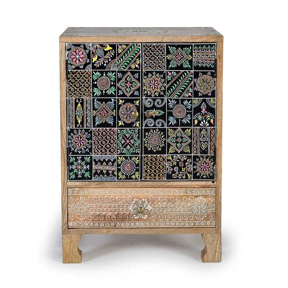 Dank seiner Herstellung aus hochwertigem Mangoholz bringt der Nachtschrank „Fenezian“ die natürliche Schönheit dieses Materials perfekt zur Geltung. Mangoholz ist bekannt für seine Stabilität und seine ausdrucksstarke Maserung, die durch die handgefertigten Verzierungen kunstvoll ergänzt wird. Jede Kommode ist ein Unikat – keine Maserung gleicht der anderen, und auch die handbemalten Ornamente sorgen für eine individuelle Gestaltung. Die Deckplatte, Seitenflächen und die Schubladenfront sind mit weißen Ornamenten und Mustern verziert, während die dunkel gehaltenen Türfronten durch feine weiße Linien optisch unterteilt werden. Jedes der dabei entstehenden Rechtecke wird von einem einzigartigen, farbenfrohen Muster geschmückt, das den handwerklichen Charakter des Möbelstücks betont.