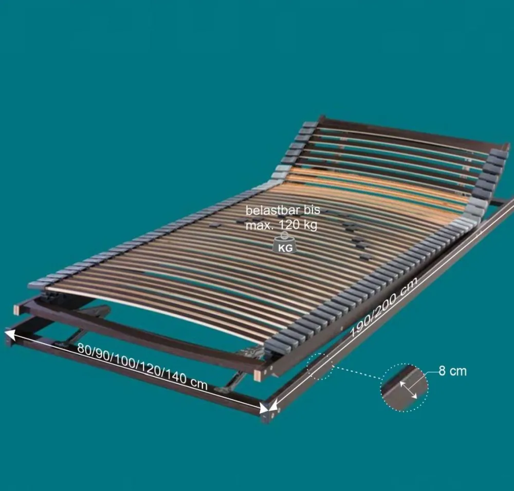 Dieser Lattenrost ist auch geeignet für Betten mit Auflagewinkeln, durchgehenden Auflageleisten und Quertraversen. Er ist kompatibel mit Kaltschaummatratzen, Taschenfederkernmatratzen und Latexmatratzen und hat eine Höhe von 8 cm. Die maximale Belastbarkeit des Lattenrostes beträgt 120 kg.