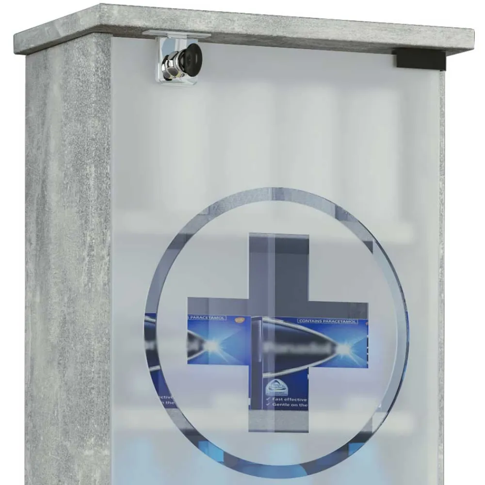 Der Medizinschrank „Woba“ zeichnet sich durch seine hervorragende Qualität und Verarbeitung aus. Die melaminbeschichtete Holzwerkstoffoberfläche in Beton Optik ist nicht nur widerstandsfähig gegen Kratzer und Abnutzung, sondern auch gegen Feuchtigkeit und Hitze. Dies macht den Schrank besonders langlebig und pflegeleicht – ideal für die Aufbewahrung von Medikamenten. Die milchig weiße Glastür, versehen mit langlebigen Metallbeschlägen und einem stilvollen Kreuzmotiv, rundet das moderne Design ab und ermöglicht einen diskreten Einblick in den Inhalt.