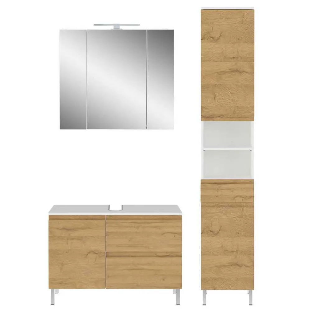 Das dreiteilige Set umfasst einen Hochschrank, einen Spiegelschrank und einen Waschtisch-Unterschrank – jedes Möbelstück wurde mit cleveren Stauraumlösungen entworfen: