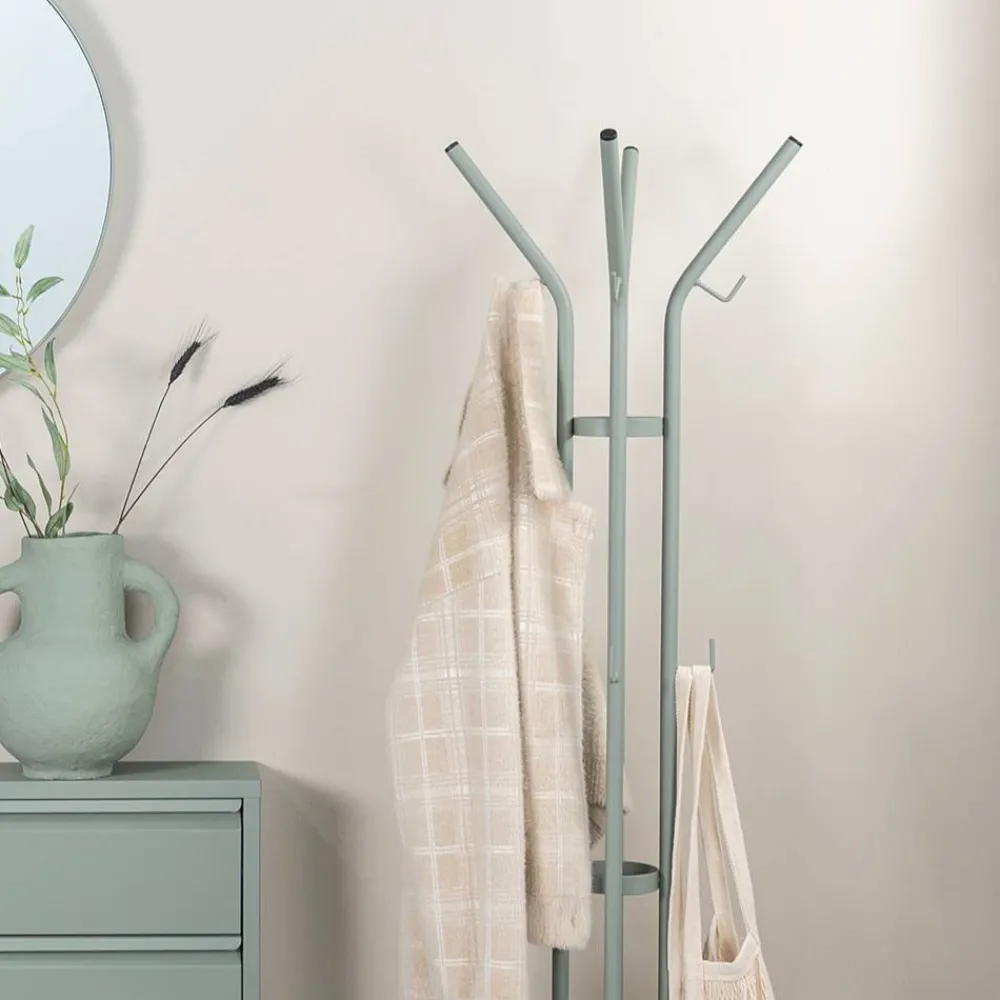 Entdecken Sie die perfekte Mischung aus Funktionalität und Design mit dem Garderobenständer „Viktorion“. Diese vielseitig einsetzbare Standgarderobe fügt sich nahtlos in Ihren Flur, Ihre Diele oder Ihren Eingangsbereich ein. Doch auch im Büro oder Schlafzimmer macht sie eine ausgezeichnete Figur und sorgt für praktische Ordnung. Die angenehme graugrüne Farbgebung verleiht jedem Raum eine frische, moderne Note.