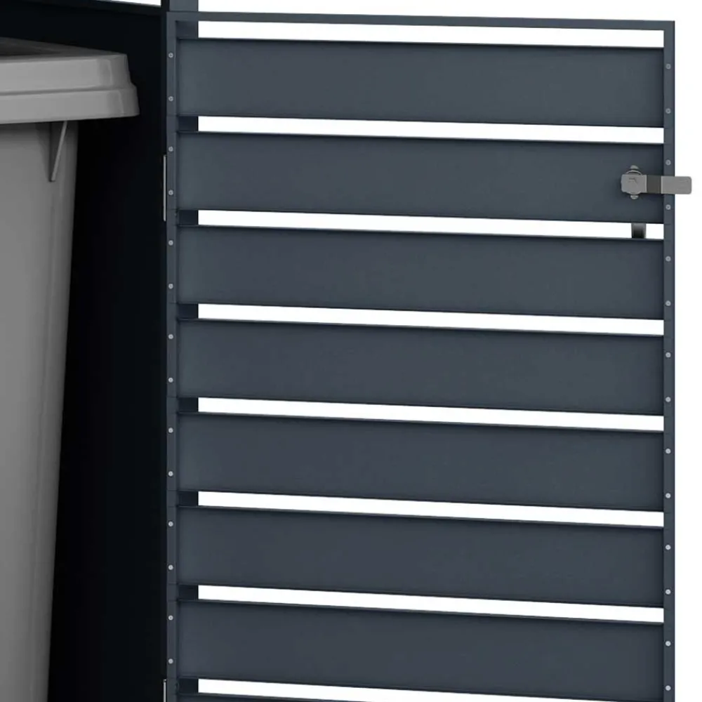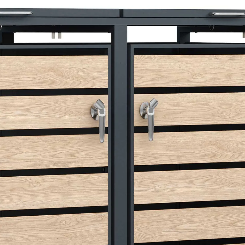 Die Türen der Mülltonnenbox sind mit luftdurchlässigen Zwischenräumen versehen, was eine optimale Belüftung sicherstellt und unangenehme Gerüche minimiert. Die Türfronten aus Kunststoff in Holzoptik setzen einen eleganten Kontrast zum anthrazitfarbenen Stahl und verleihen der Box eine besonders stilvolle Note. Dieses durchdachte Design sorgt nicht nur für eine ansprechende Optik, sondern auch für eine verbesserte Funktionalität. Durch die Belüftungsschlitze kann die Luft zirkulieren, wodurch die Bildung von Gerüchen reduziert wird – ein wichtiger Aspekt für die Aufbewahrung von Mülltonnen.