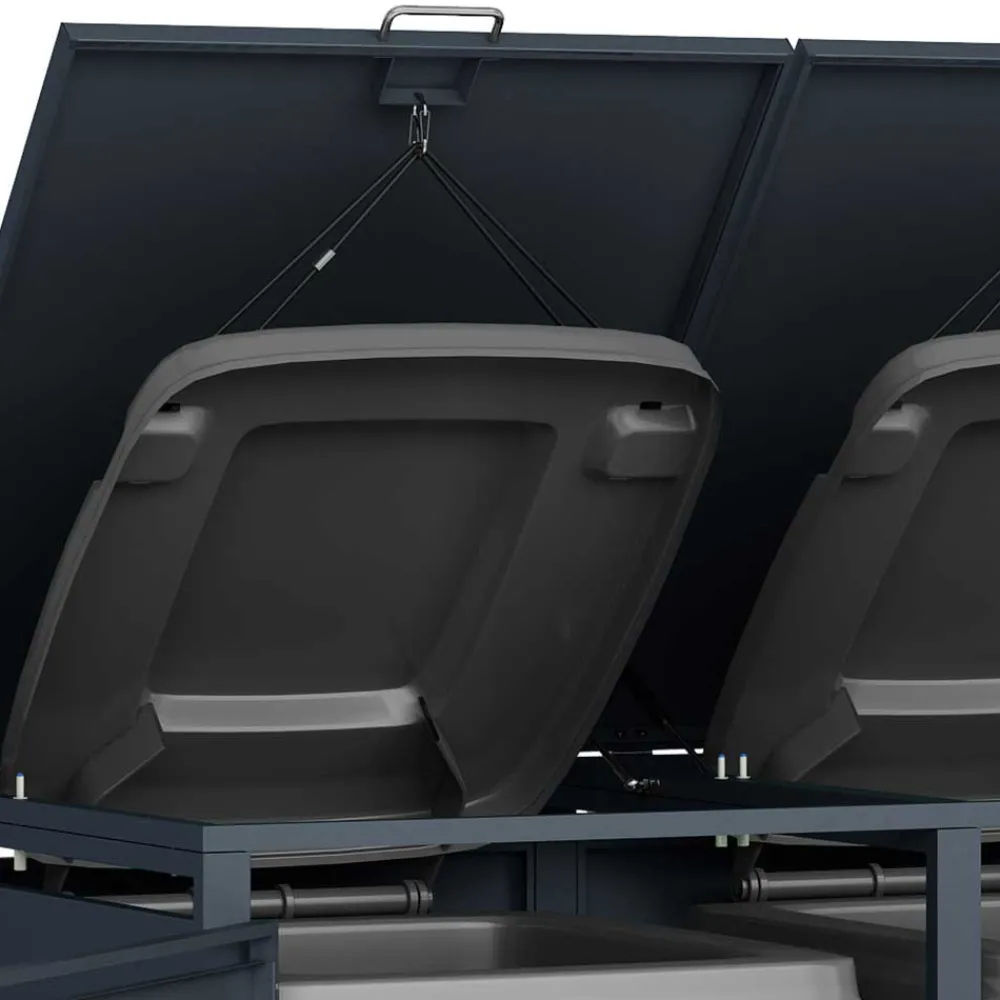 Die verschließbaren Türgriffe in Chromfarben inklusive Schlüssel bieten zusätzliche Sicherheit. Dadurch wird sichergestellt, dass Ihre Mülltonnen sicher verschlossen sind und Unbefugte keinen Zugang haben. Der Mülltonnendeckel kann mit einem Band an der Klappe befestigt werden, sodass er automatisch mit öffnet – eine kleine, aber äußerst praktische Erleichterung im Alltag. Kein mühsames Hantieren mehr mit schweren Deckeln – ein Handgriff genügt, und schon haben Sie beide Hände frei, um Ihren Müll zu entsorgen.