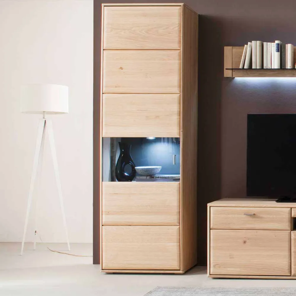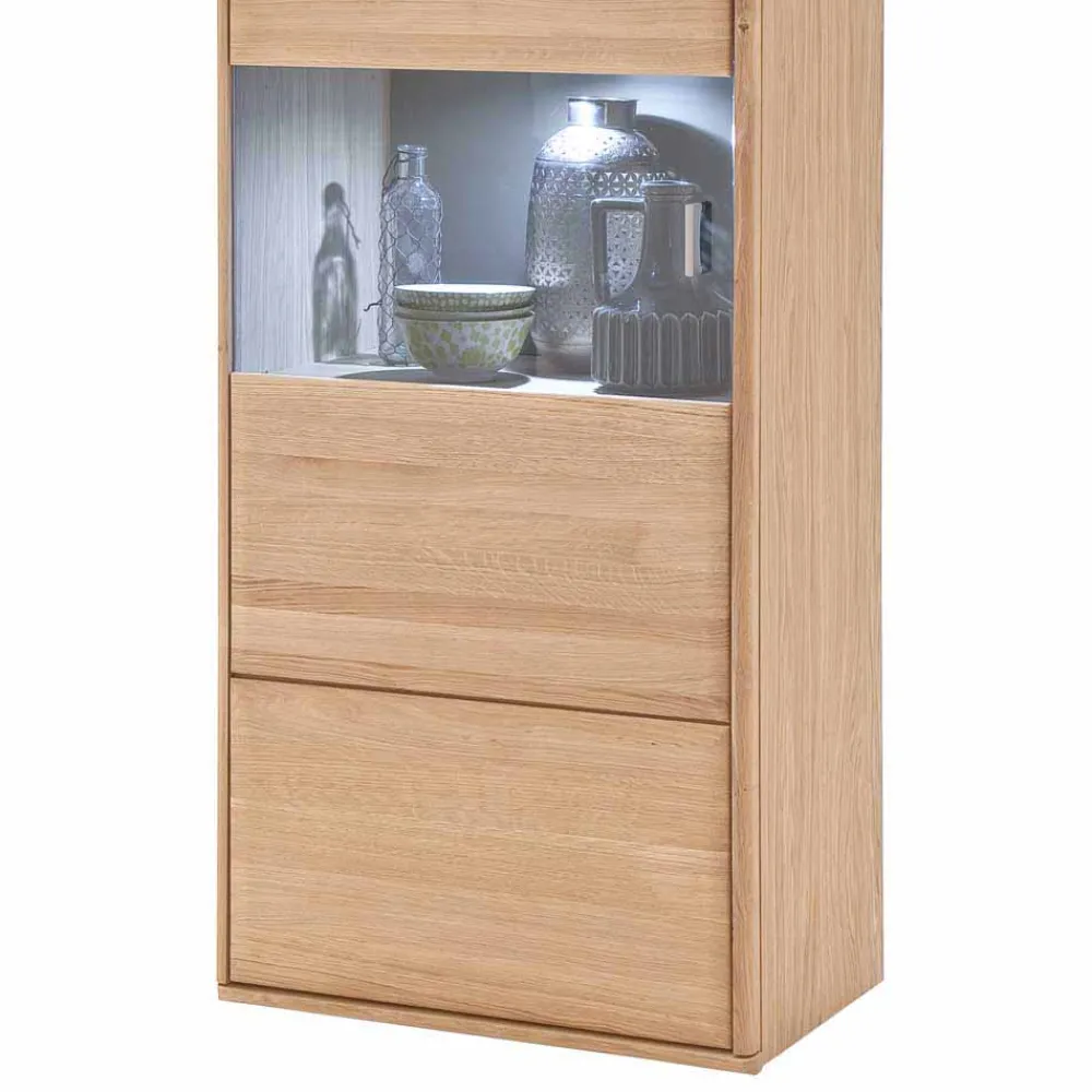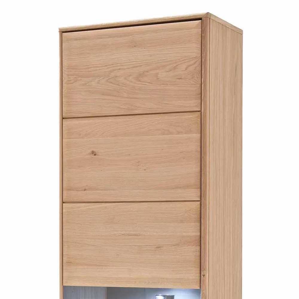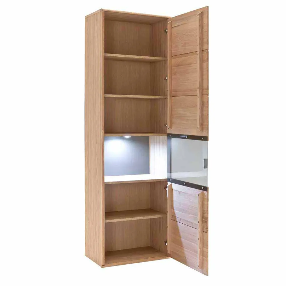 Die „Vernella“ Standvitrine ist ein eindrucksvolles Möbelstück mit einer Front aus massiver Eiche. Eiche ist ein besonders hartes, aber dennoch elastisches Holz, bekannt für seine hohe Dichte und Stabilität. Diese Eigenschaften garantieren eine ausgezeichnete Langlebigkeit und Beständigkeit gegen täglichen Verschleiß. Der warme und natürliche Farbton der Eiche sorgt dabei für ein gemütliches und einladendes Ambiente.