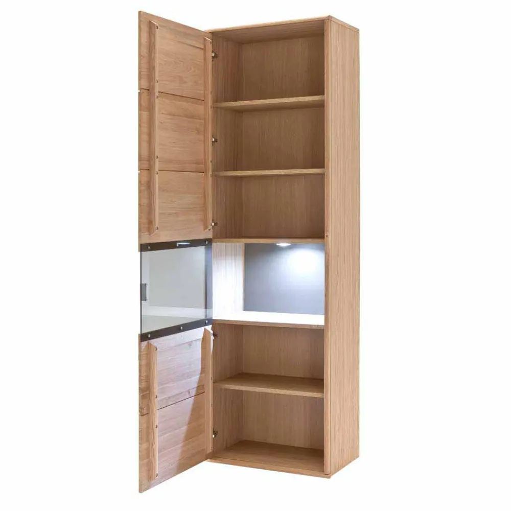 Die Maße der Vitrine sind mit 64 cm Breite, 206 cm Höhe und 39 cm Tiefe ideal bemessen, um vielfältigen Stauraum zu bieten, ohne zu wuchtig zu wirken. Die Vitrine verfügt über eine Tür mit Soft Close Funktion und einem attraktiven Glaseinsatz aus grauem Parsolglas, versehen mit hochwertigen Metallbeschlägen. Der Türanschlag ist wahlweise rechts oder links anbringbar, was eine flexible Raumgestaltung ermöglicht.
