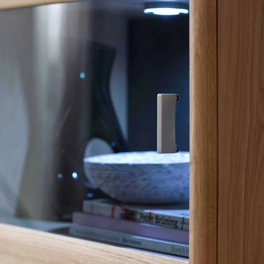 Der Korpus der Vitrine ist in Eiche Bianco furniert und geölt, was die Eleganz des Designs unterstreicht. Die Böden und die Rückwand sind in attraktiver Holzoptik foliert. Abgerundete Kanten des Korpus verleihen der Vitrine einen weichen, modernen Look, der dennoch von der Solidität und Robustheit des Designs zeugt.