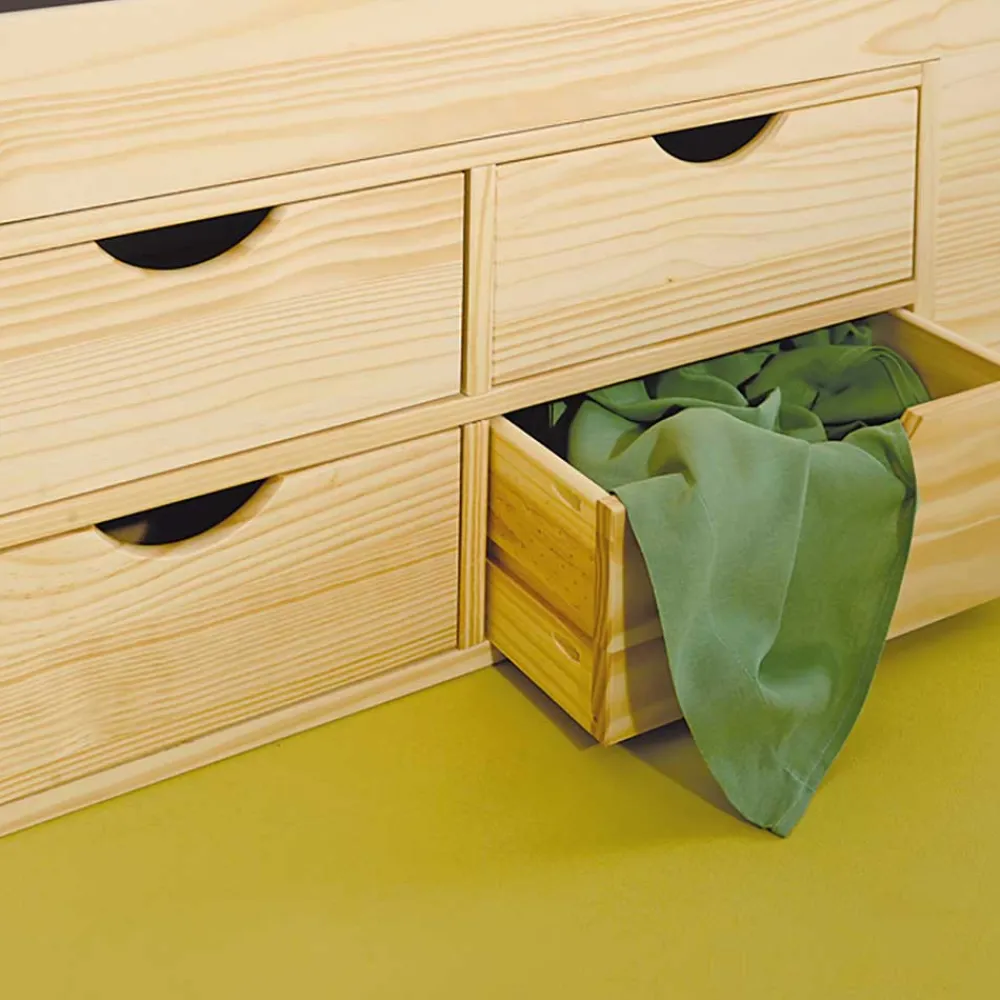 Massives Kiefernholz ist nicht nur für seine Langlebigkeit und Stabilität bekannt, sondern schafft auch eine warme, einladende Atmosphäre. Die natürlichen Eigenschaften des Holzes regulieren das Raumklima auf natürliche Weise, indem sie die Luftfeuchtigkeit aufnehmen und abgeben. Dies sorgt für ein angenehmes Schlafklima und verbessert Ihr Wohlbefinden.