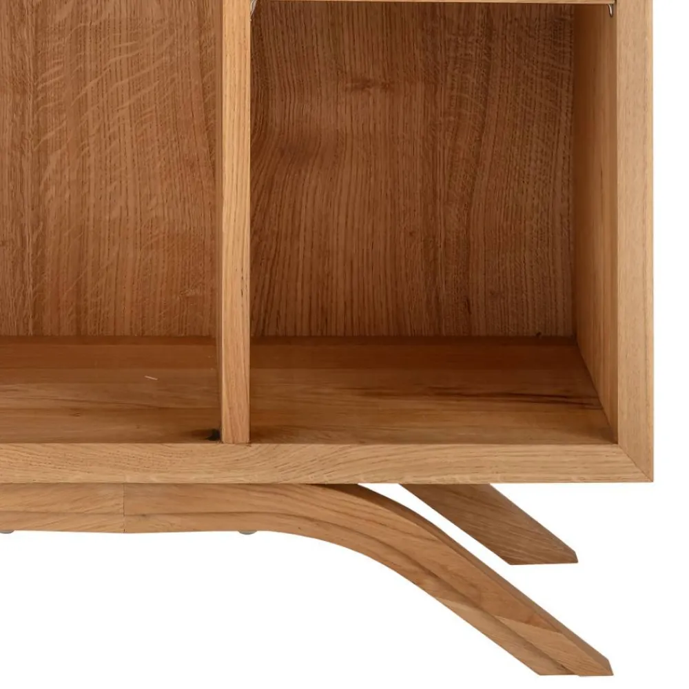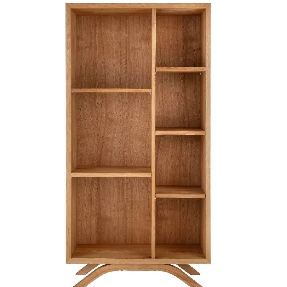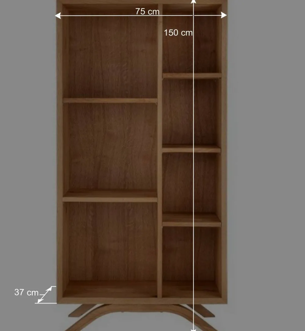 Mit fünf Einlegeböden bietet das Regal eine raffinierte Innenstruktur: Drei größere Fächer auf der linken Seite und vier kleinere rechts schaffen Platz für Bücher, Deko oder Alltagsgegenstände. Die stabile Unterkonstruktion aus Massivholz mit vier formschön gestalteten Füßen sorgt für sicheren Stand – dennoch wird empfohlen, das Möbel zusätzlich an der Wand zu fixieren, um maximale Kippsicherheit zu gewährleisten.