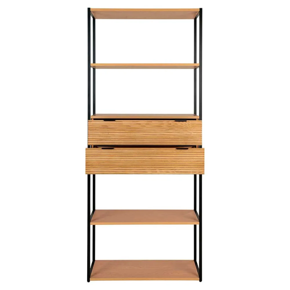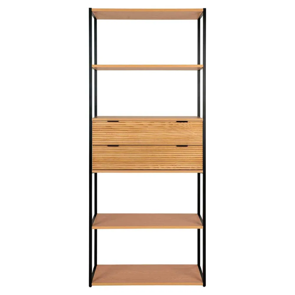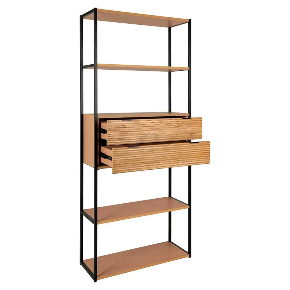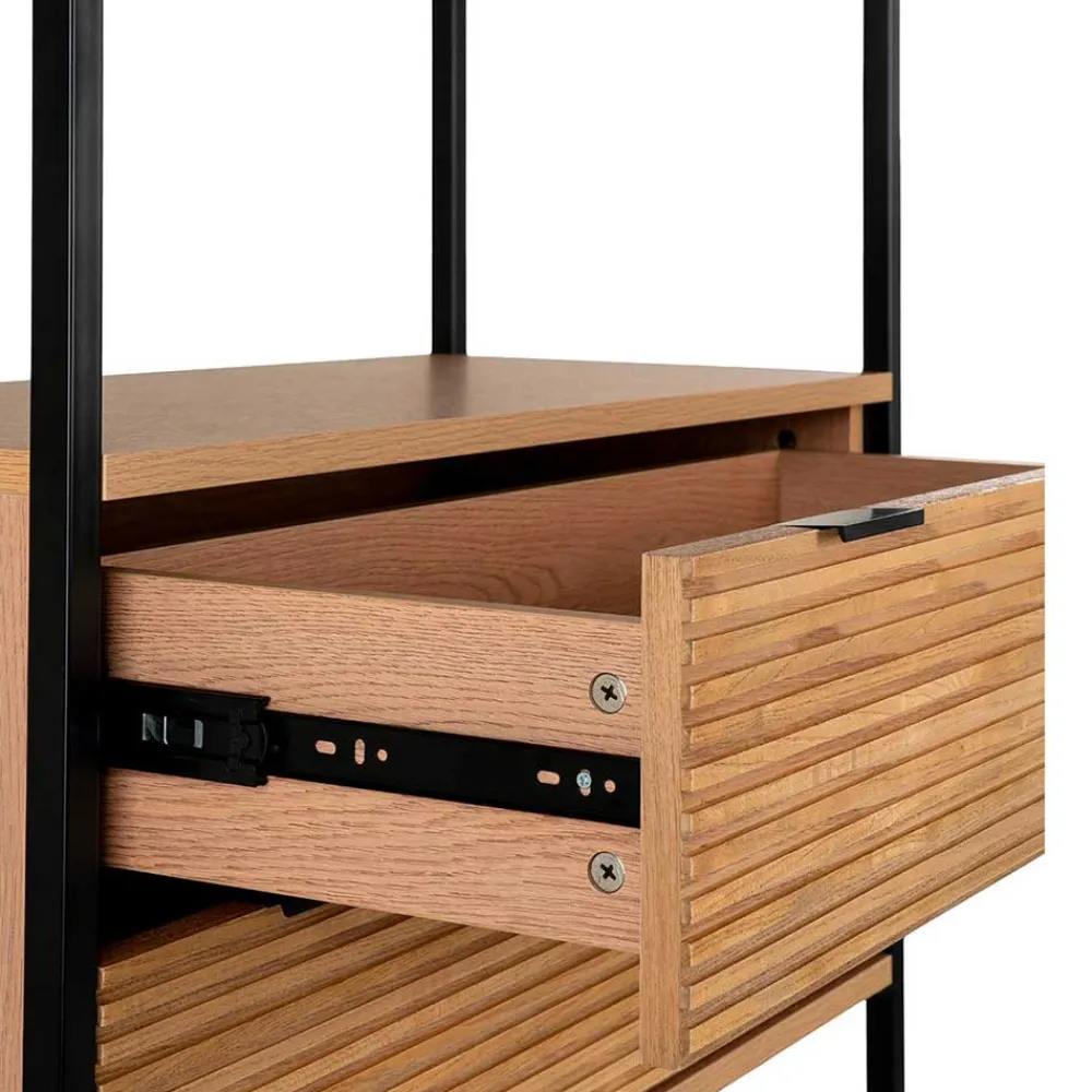Das Regal „Lennilia“ überzeugt durch seine sorgfältige Verarbeitung und die Verwendung edler Materialien. Die Oberflächen des Holzwerkstoffs sind mit Echtholzfurnier und Lack versehen, wodurch sie besonders pflegeleicht und strapazierfähig sind. Das Metallgestell sorgt für eine stabile Konstruktion und verleiht dem Regal gleichzeitig einen industriellen Touch. Die zwei Schubladen sind mit robusten Metallauszügen ausgestattet und bieten zusätzlichen Stauraum für kleinere Gegenstände.