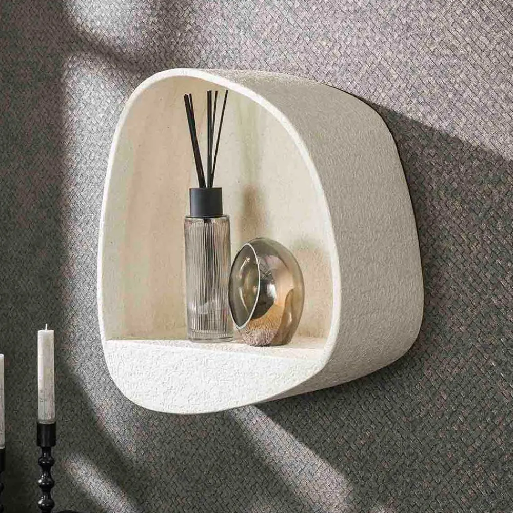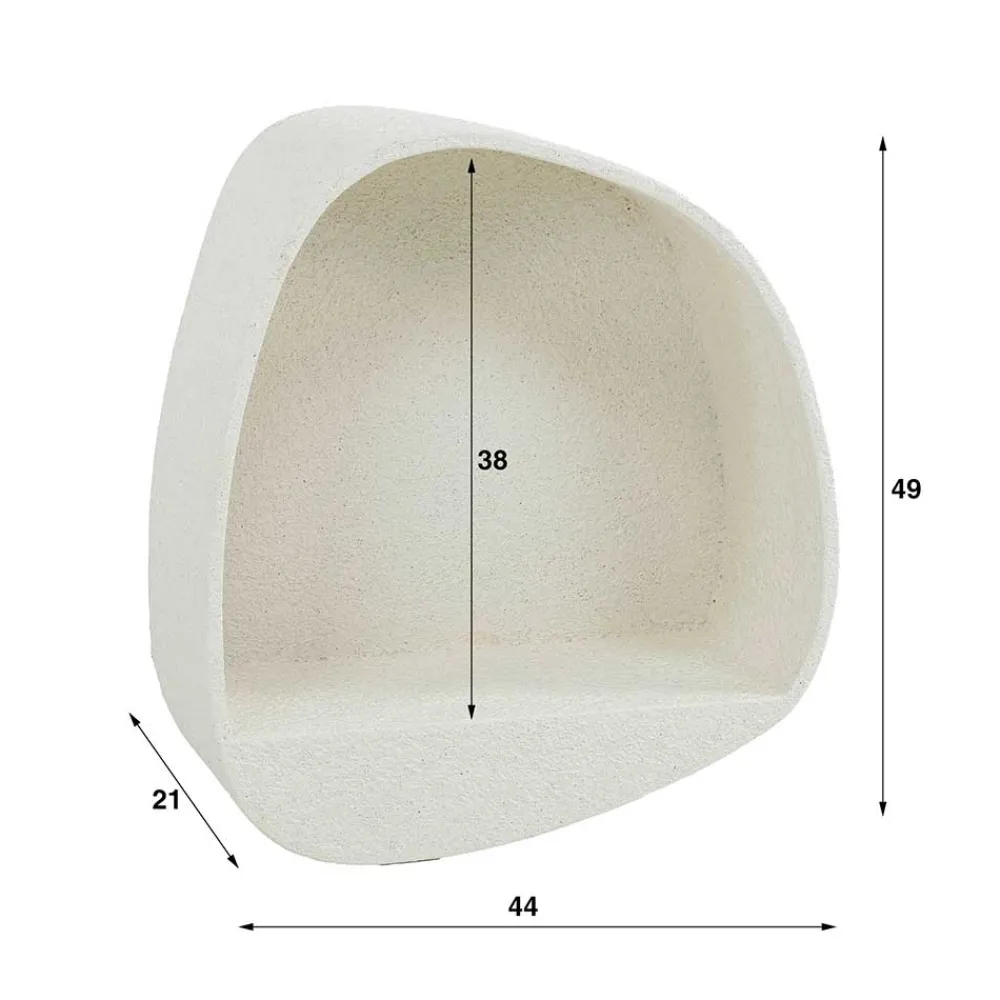 Funktionalität und Design gehen bei „Mayo“ Hand in Hand. Mit einer Größe von 43 cm Breite, 48 cm Höhe und 21 cm Tiefe bietet das Hängeregal genügend Platz, um ausgewählte Dekorationen geschmackvoll in Szene zu setzen. Im Inneren befindet sich eine elegante Ablagefläche, die perfekt geeignet ist, um kleine Pflanzen, Kerzenhalter oder Kunstobjekte zu präsentieren. Die organisch geformte Front sorgt für ein harmonisches Zusammenspiel von Schatten und Licht, das Ihre Deko stilvoll betont. Ob im Wohnzimmer über dem Sideboard, im Flur als Solitär oder im Schlafzimmer über einer Kommode – „Mayo“ verleiht jedem Raum eine besondere Tiefe und schafft eine wohnliche Atmosphäre, die inspiriert und beruhigt zugleich.