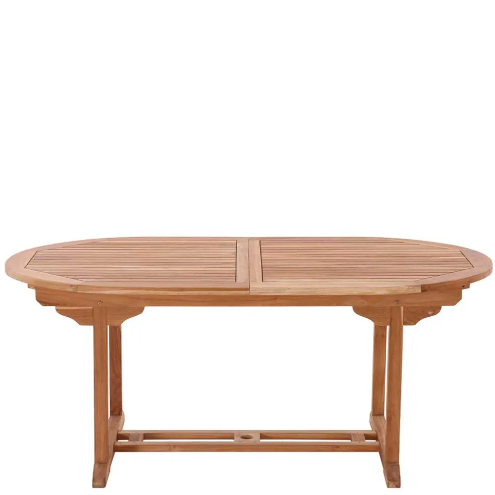 - Platte aus Massivholzlatten, im Auszug eine Öffnung für den Sonnenschirm (Durchmesser ca. 5 cm)