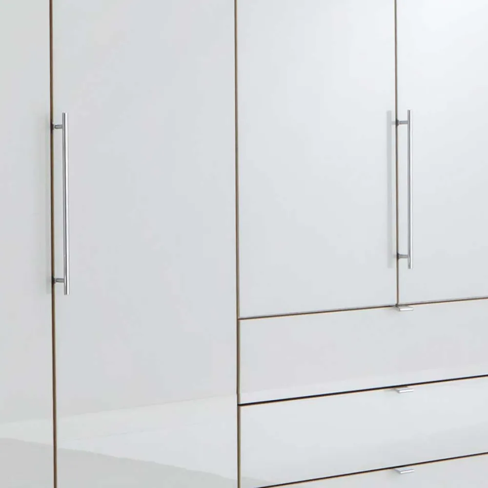 Der Korpus in edlem Hellgrau, kombiniert mit Fronten aus weißem Glas, verleiht dem Kleiderschrank eine moderne und erfrischende Optik. Die Folierung des Korpus bietet zahlreiche Vorteile: Sie ist pflegeleicht, widerstandsfähig gegen Kratzer und erleichtert die Reinigung – ein ideales Merkmal für den alltäglichen Gebrauch.